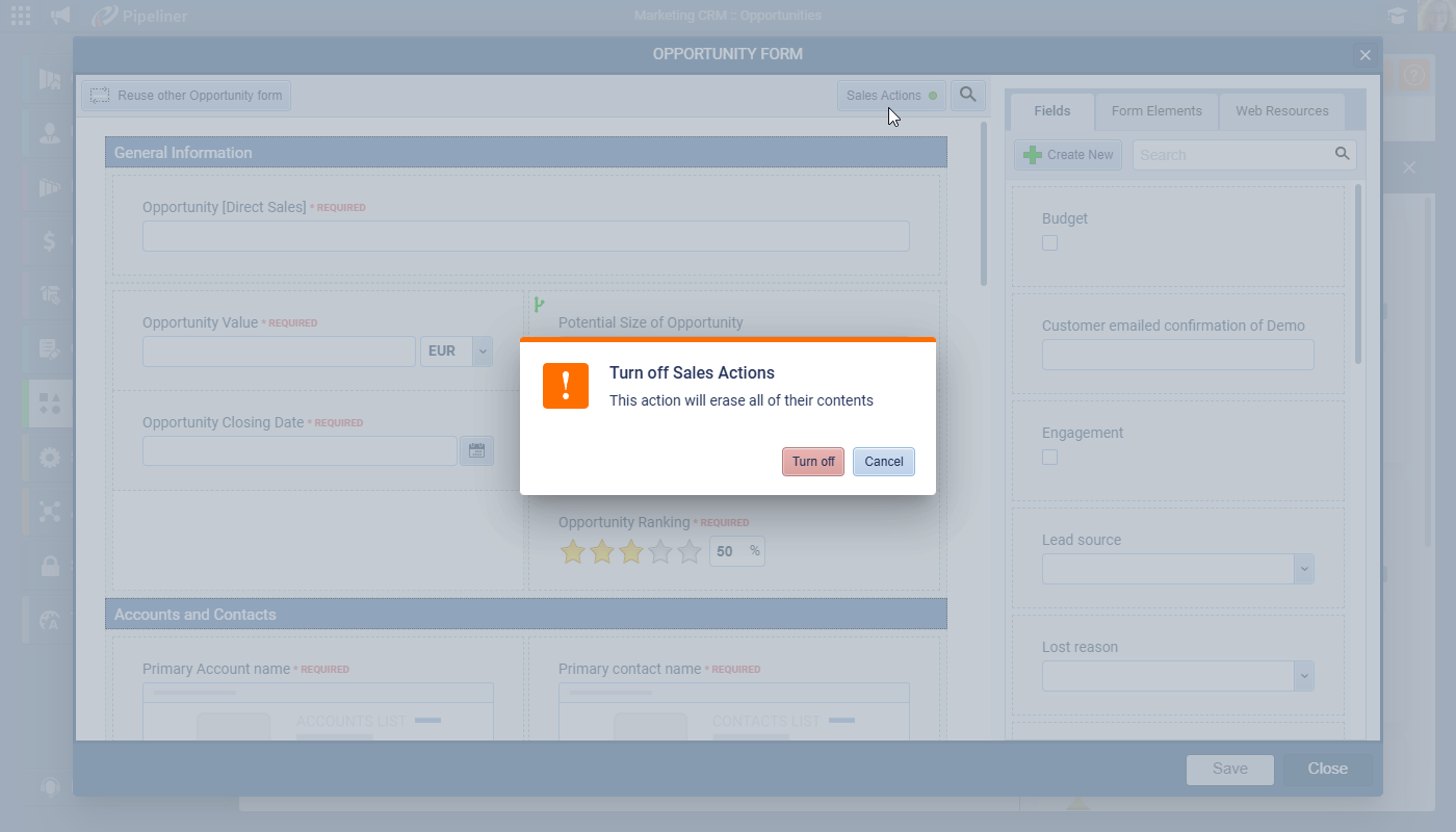 We’ve added a confirmation dialog to prevent accidental dataData Data is a set of quantitative and qualitative facts that can be used as reference or inputs for computations, analyses, descriptions, predictions, reasoning and planning. loss when turning off “Sales Actions“: