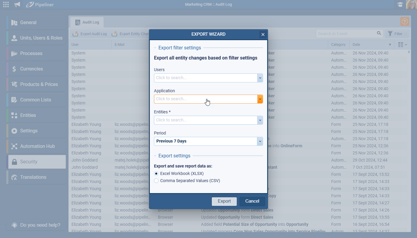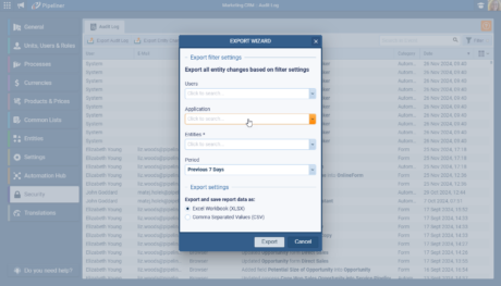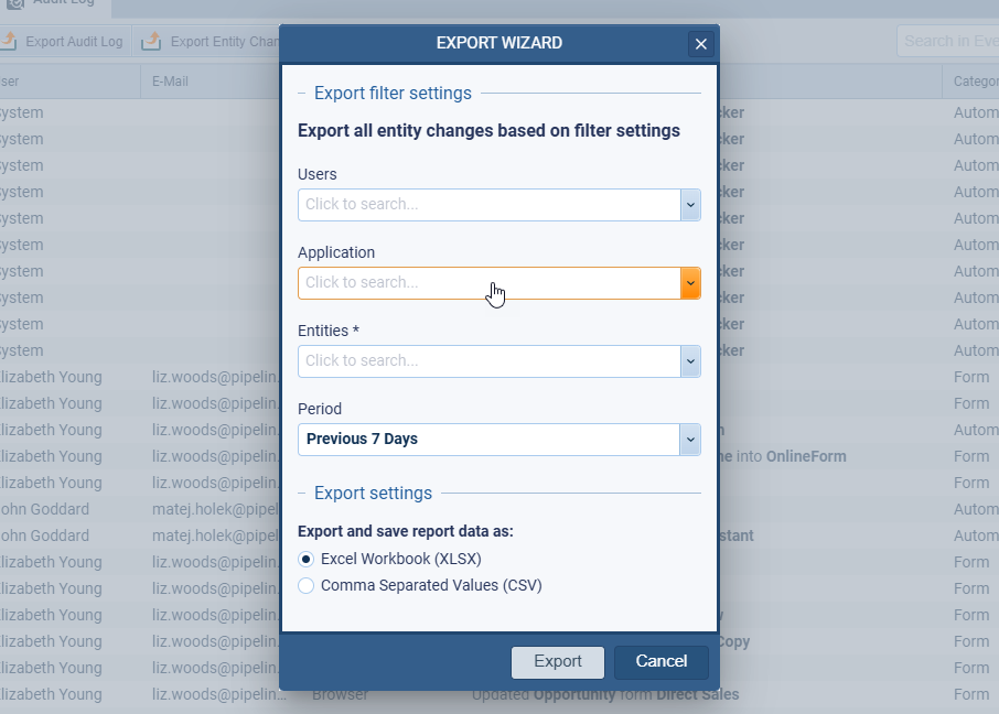Admins can now export changes made by a specific application(s) (integration). At least one user or application must be selected. ⤵