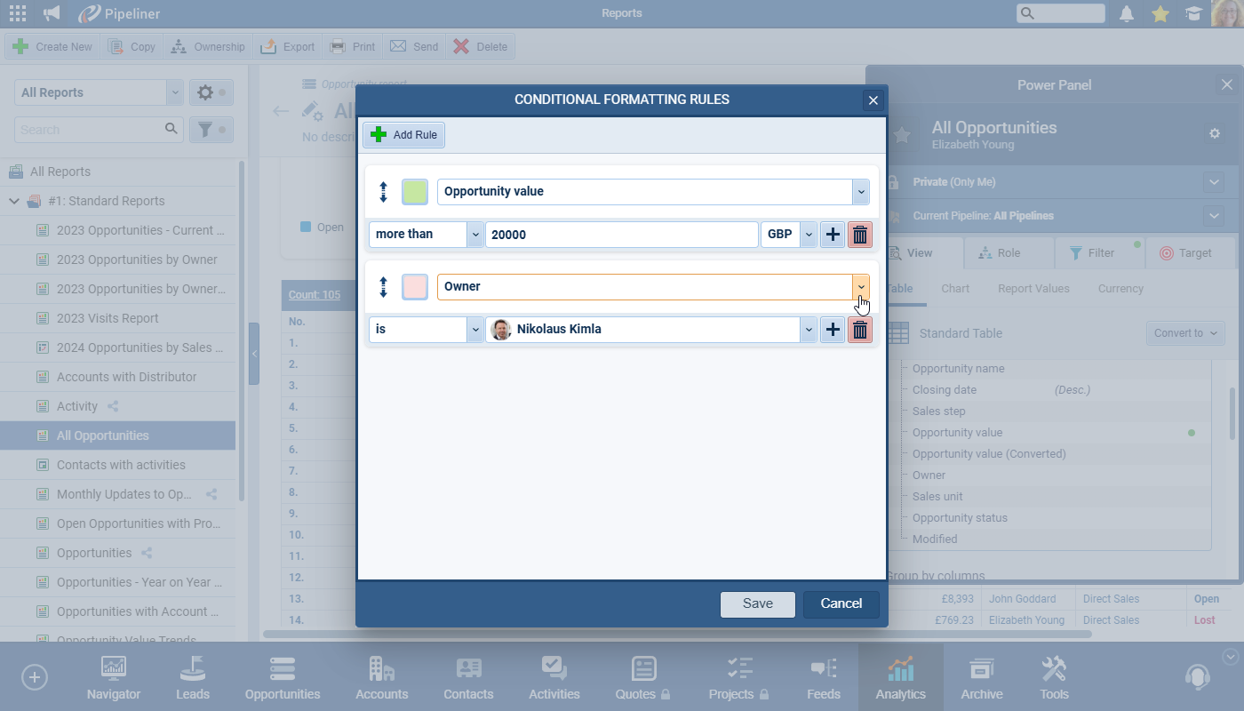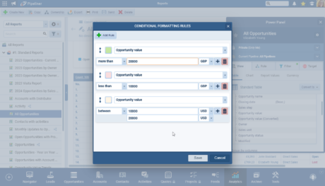In Reports, users can now choose “Conditional Formatting” to color code each cell depending on how its value compares to the rule(s) that are set up. The example below fills the “Opportunity Value” field with a different colour depending on how large the value is ⤵