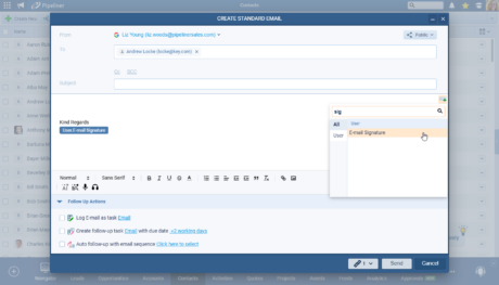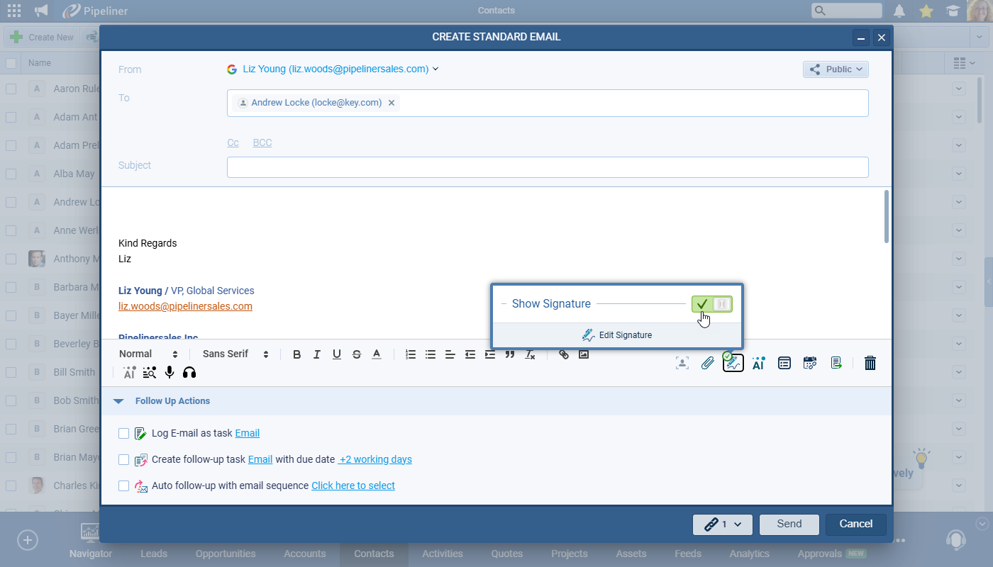 Users can now enable or disable their email signature without needing to edit it. When enabled, the user’s email signature will appear automatically at the bottom of every email they send. When disabled, no signature will be used. Enabling or Disabling the email signature will not unlink a selected email templateTemplate Template is a generic file with a framework showing the standard sections or features of a specific kind of document, used to create a new document of the same type faster and easier., preserving email template statistics. ⤵