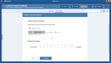 When files are uploaded, the file names will display underneath the field on the form. If a user tries to upload an invalid file type or a file that is too large, they will receive an onscreen message and will need to click on the “X” to remove the invalid file before being able to submit the form response. ⤵