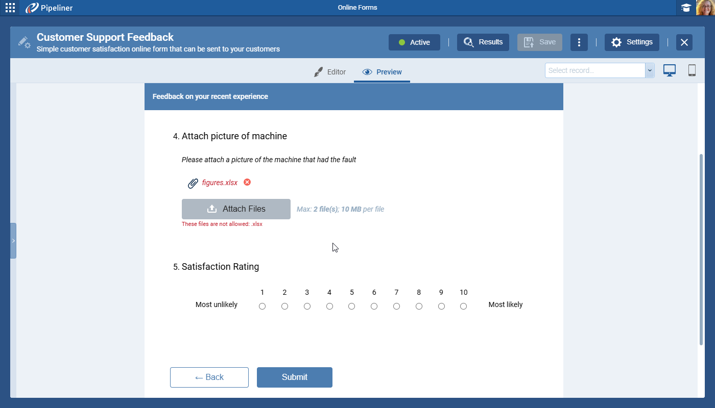 Files can be viewed, downloaded or saved from each submitted “Form Response” and from the “Online Form Statistics“. ⤵