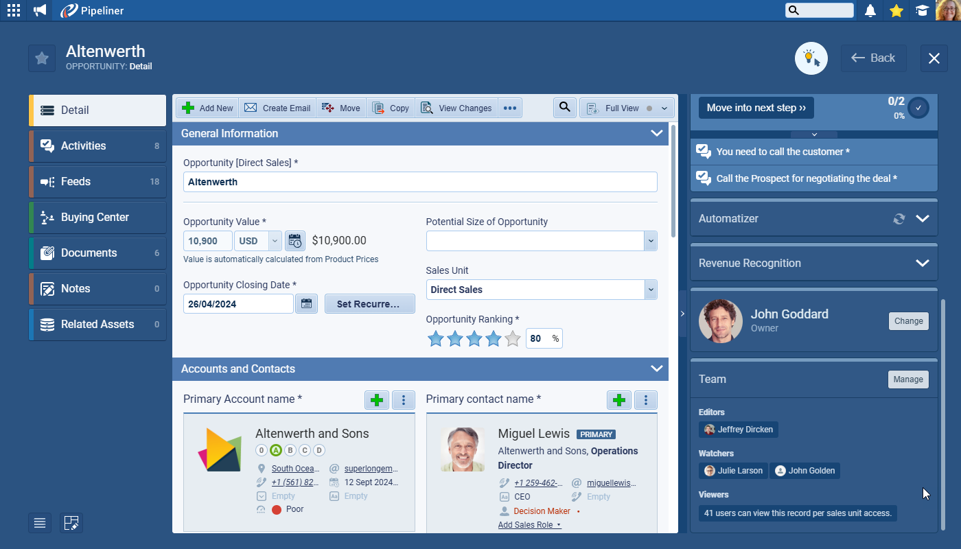 To help clarify which users have visibility of records, the Teams section has been updated to include an additional section “Viewers” to differentiate users with read access to the record based on their sales unit settings from “Watchers” who are users explicitly granted visibility to the individual record in question. ⤵