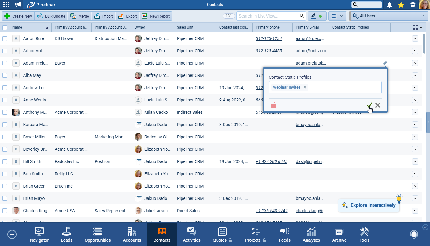 For users who prefer to use the “List View“, a new field “[Entity] Static Profiles” can be added to the list view and records can be added to a static profile using the inline edit. ⤵