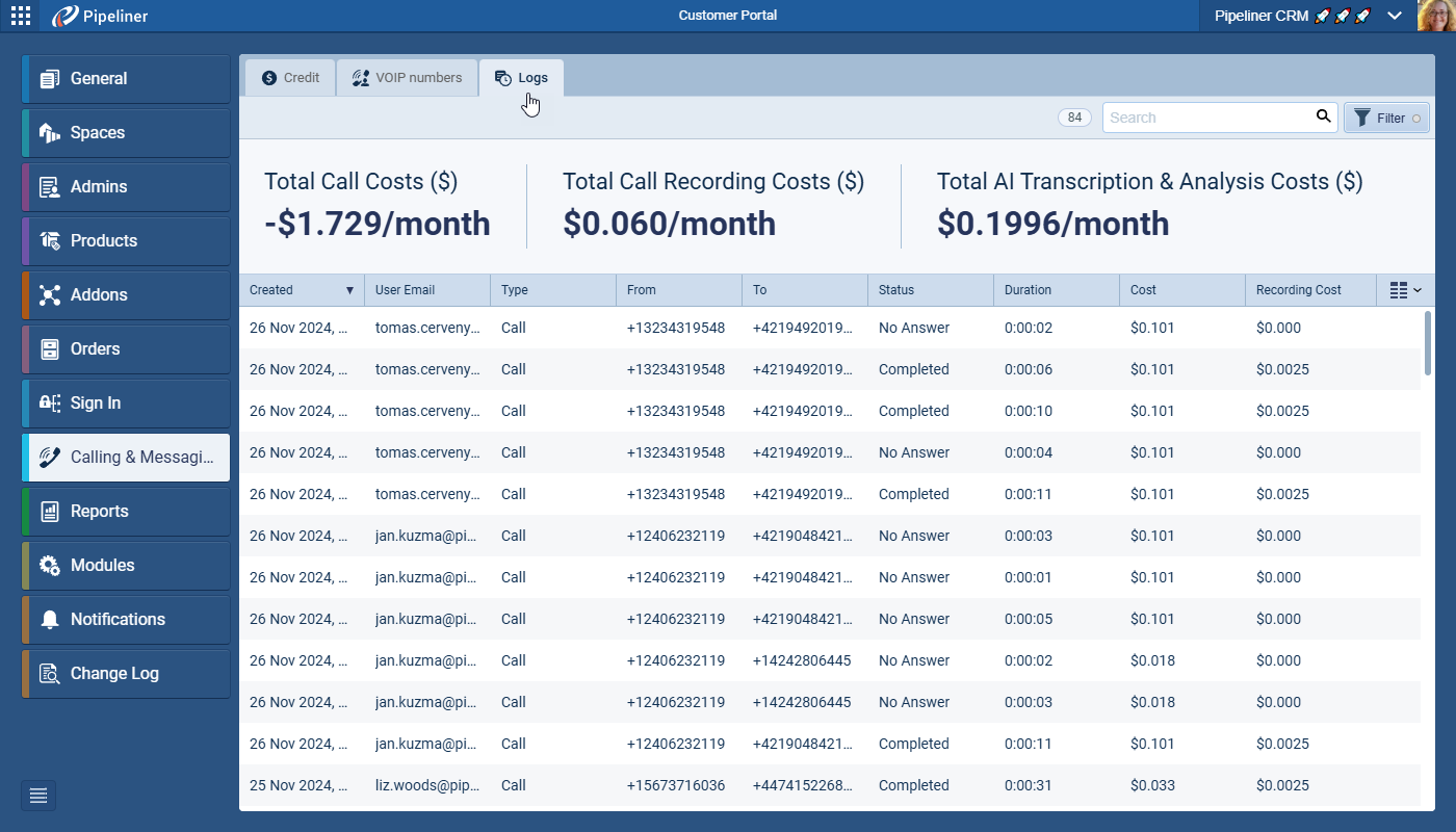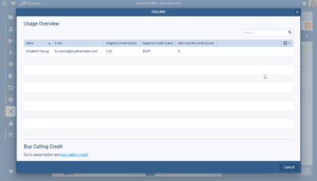 Once the “Automation Hub Calling & Messaging” integration is running, Admins will be able to see the breakdown of costs per user by clicking on the “Configure” button. This window now includes the costs for recording, transcription and AI voice intelligence. ⤵