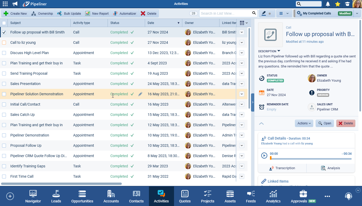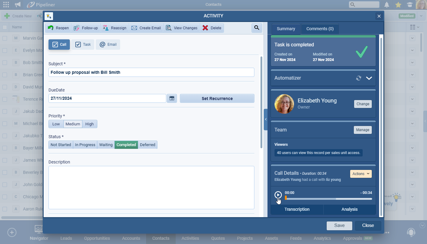 The widget is visible in record overview side panel for all activities that were created by using the “Call from Browser” option logging a call, otherwise it is hidden. Users can access the “Playback“, “Transcription” and “Analysis” but there are no Action buttons. ⤵