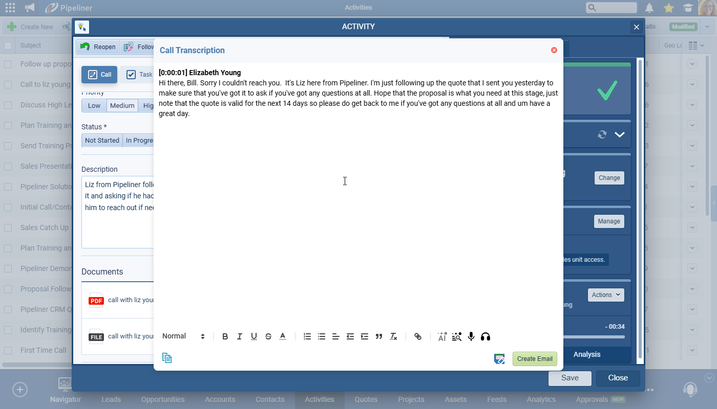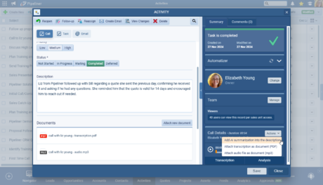 - Attach call audio as a document (mp3) › The audio file will be downloaded from our servers and attached to the task as a document.