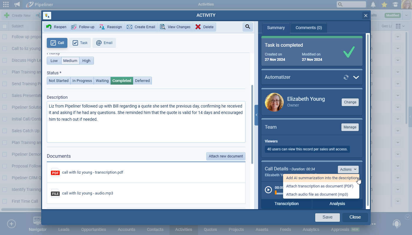 There is also a new checkbox option — Add the AI call summarization into the description — which will use AI to create a summarization from the transcription and then it will append the summarization text to the description.