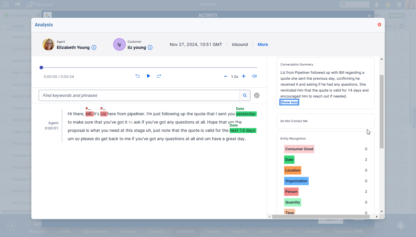 This page allows the user to playback the recording, highlights name and dates, search using keywords and categorizes the call.