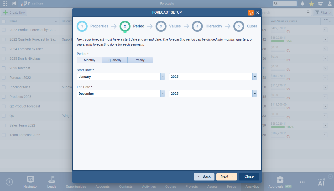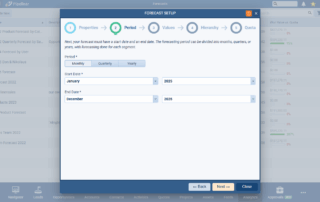 This step includes the Forecast Period — Monthly, Quarterly or Yearly — as well as Start Date and End Date for the Forecast.