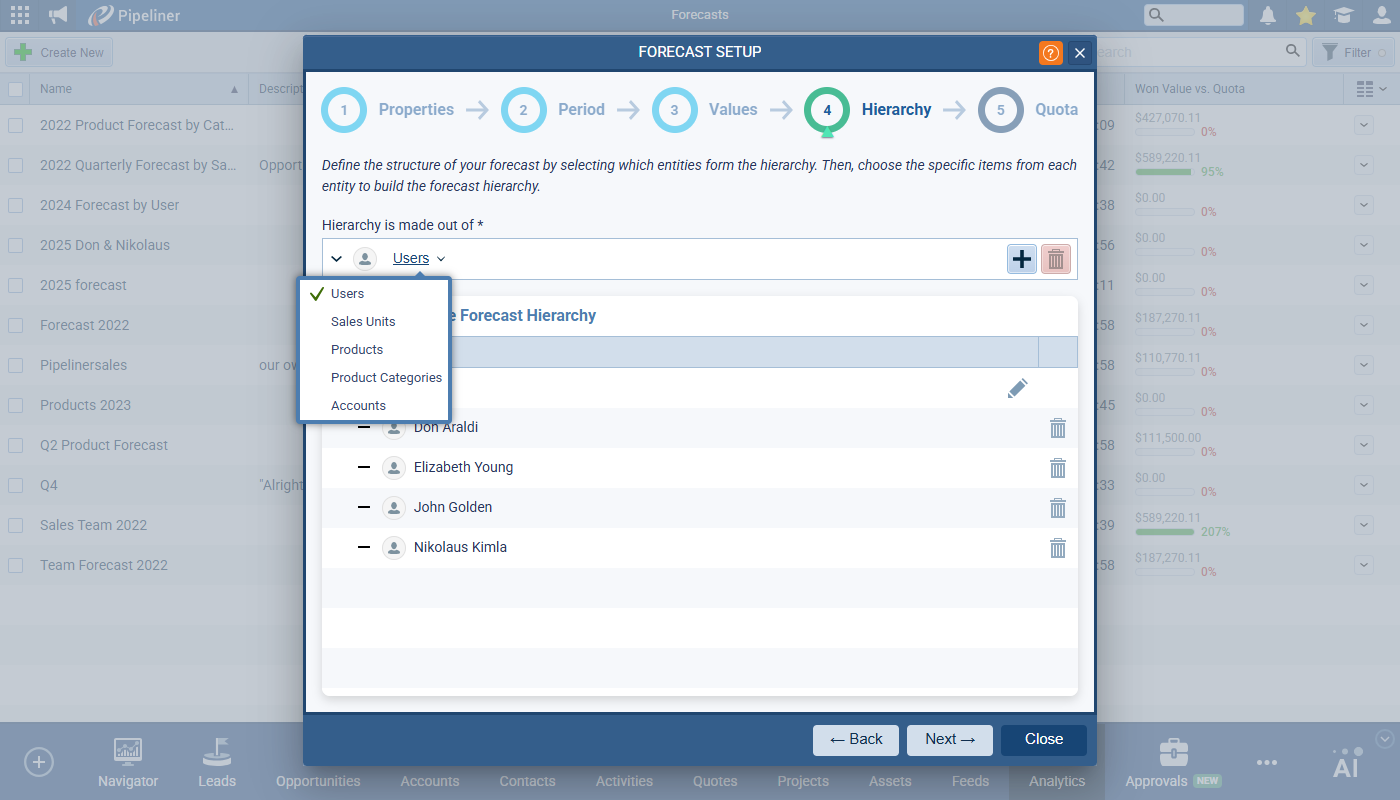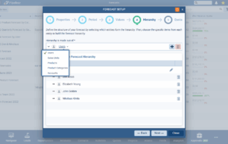 This step includes the Hierarchy selection setting — e.g. forecasting by User or by ProductProduct Product refers to anything (an idea, item, service, process or information) that meets a need or a desire and is offered to a market, usually but not always at a price. — and the Hierarchy builder where you select the include values — e.g. selected users or sales units.