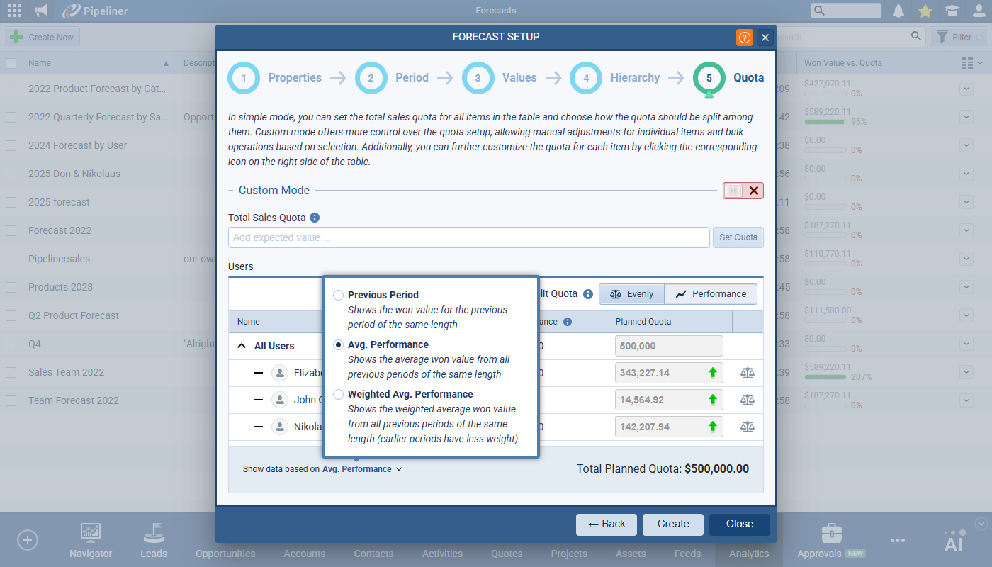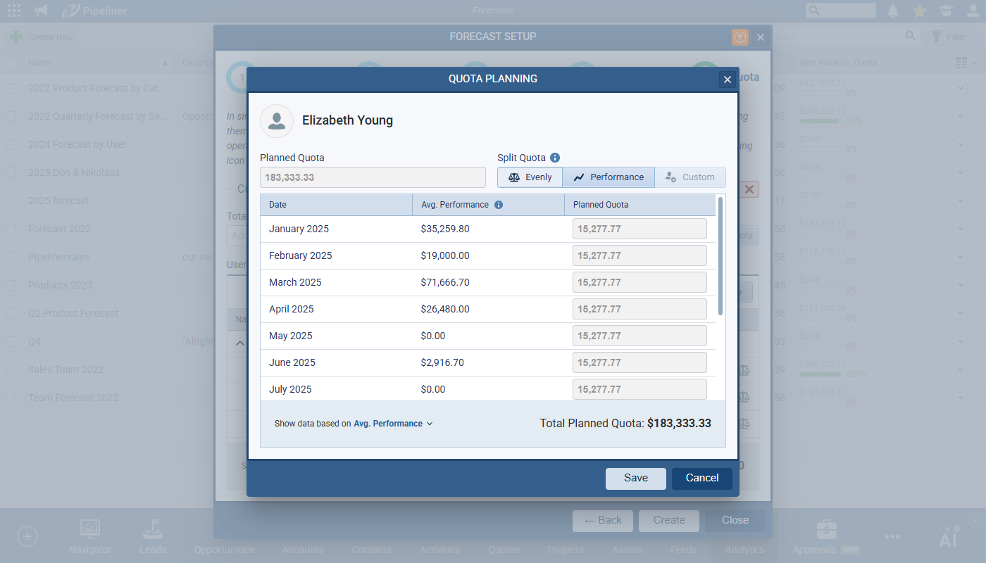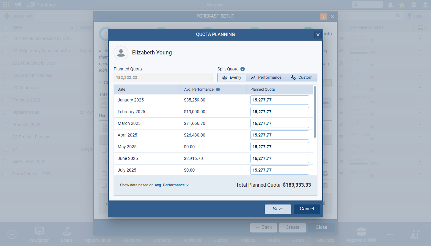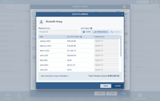 Split Quota defines how the “Total Sales Quota” is distributed. Choose between “Evenly” (default) or “Performance” options. Once selected, the Planned Quota input fields are disabled for all rows. Click on the Individual Quota button to the right of the Planned Quota to open the individual Quota Planning set up view