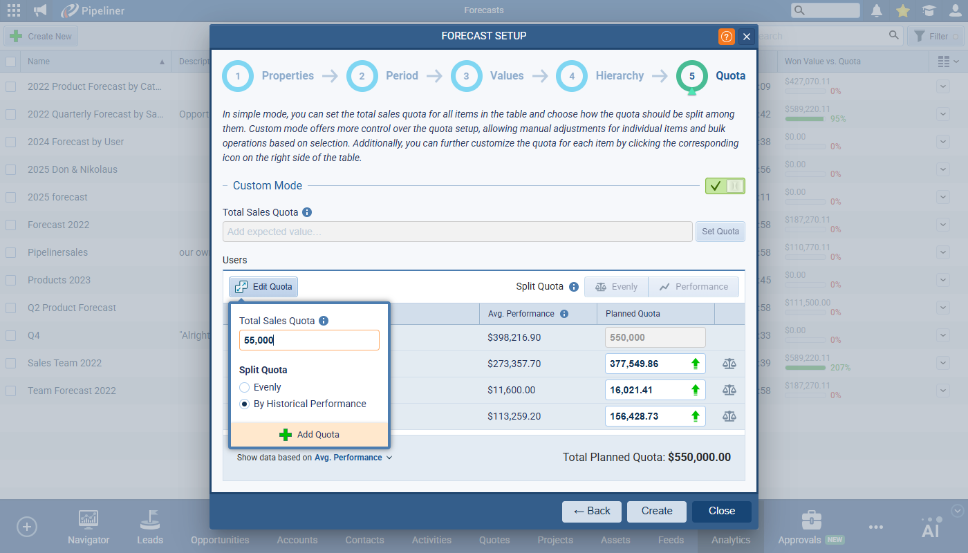 In Custom Mode, the user has full control over quota distribution — the ‘Custom‘ option is enabled and ‘Planned Quota‘ fields are editable.