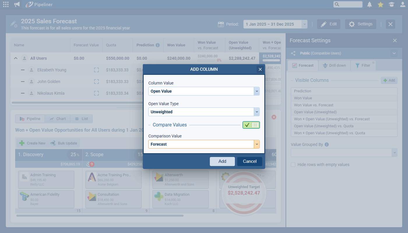 In Settings › Forecast Settings, the Add column option has been improved to show only relevant settings for the current selection. We’ve added a ‘Compare Values‘ toggle, which shows the ‘Comparison Value’ field when ON.