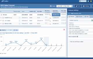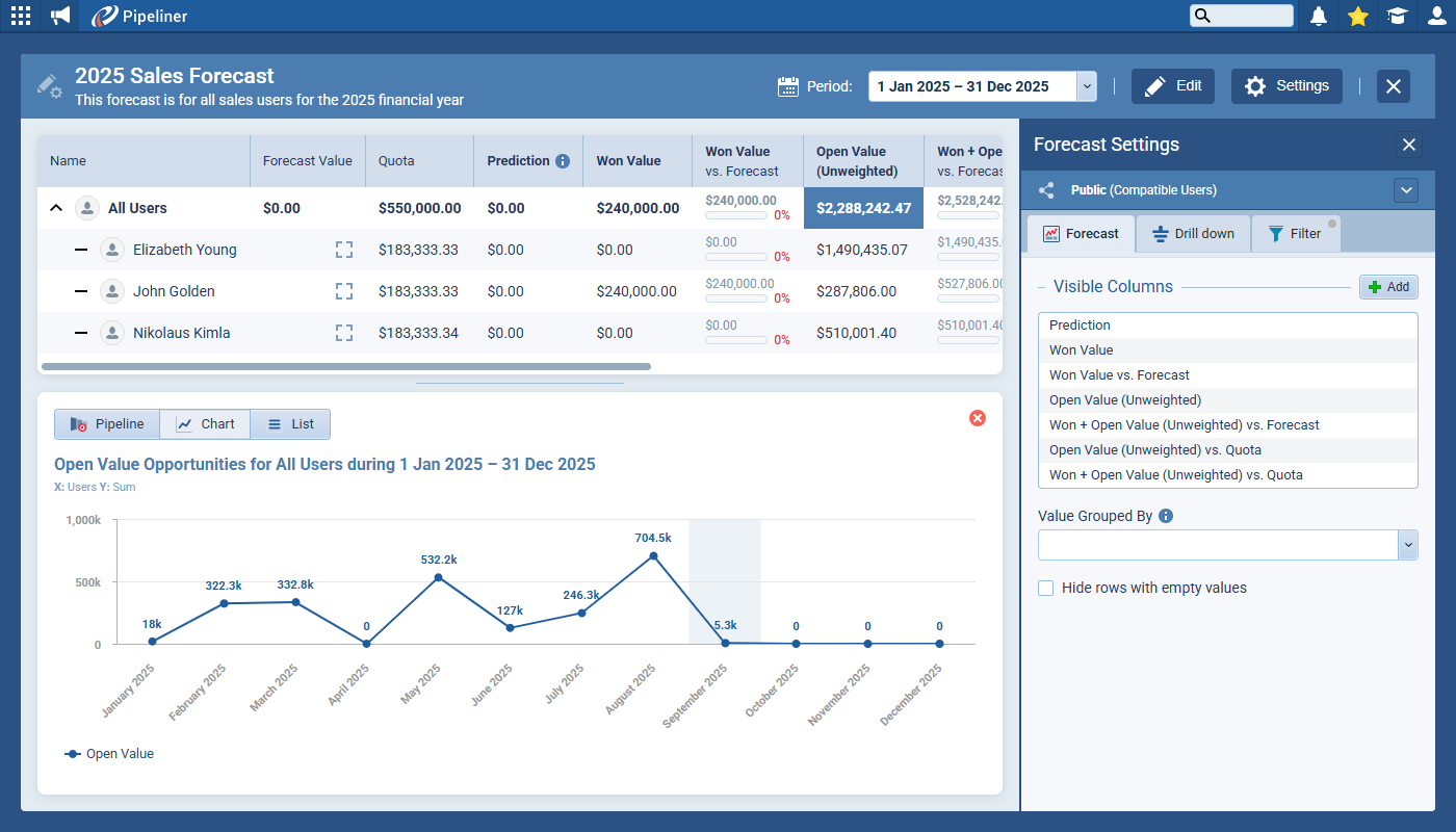 When a user clicks Create to create a new Forecast, the “Won + Open Value (Unweighted) vs. Forecast” cell for the total row will be selected and the pipeline view in the drilldown options will be opened. We have expanded the view selector in drilldown so it’s easier to switch between Pipeline, Chart or List.