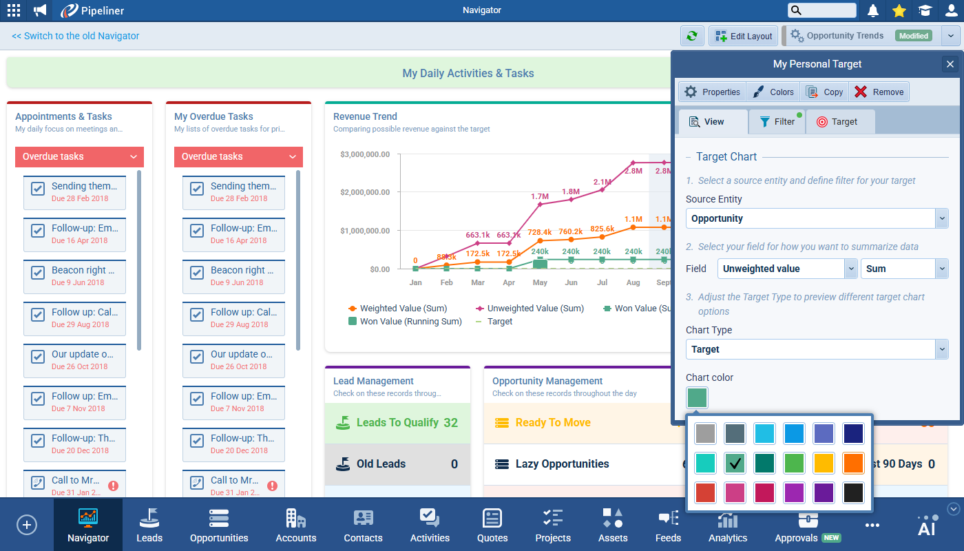 - A chart color selector was added to the bottom of the settings pane (this selector is the same as is used in Reports chart settings).