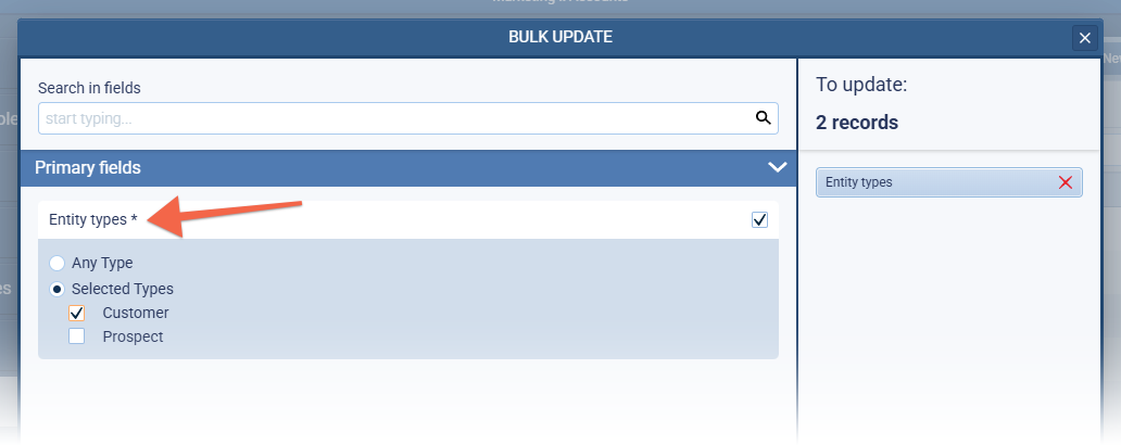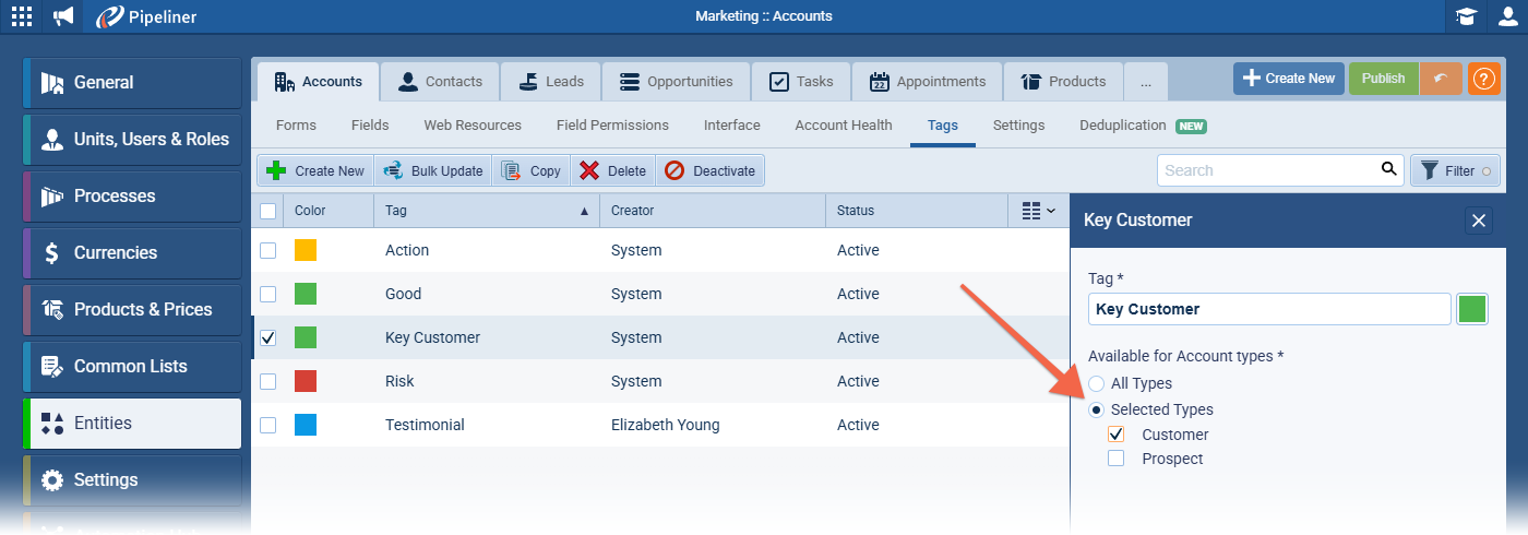 Admins can choose whether a tag is available for “All Types” of form for the entity or “Selected Types“.