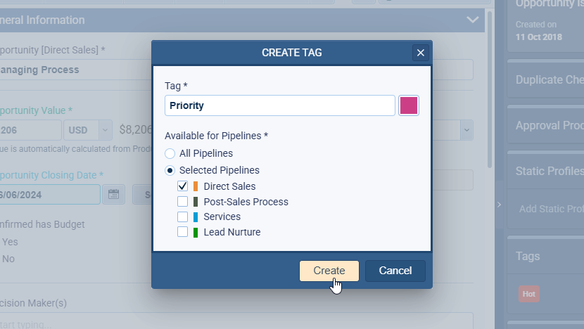 This release makes it possible to specify which tags should be available for selection by users when using specific forms. For example, some tags might only be relevant when using a “CustomerCustomer Customer is an individual or an organization that purchases a product or signs up for a service offered by a business.” type of “Account” and not when using a “Prospect” type.