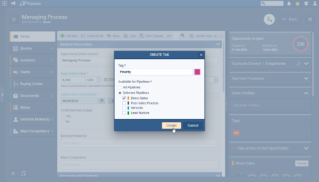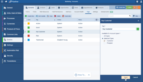 This release makes it possible to specify which tags should be available for selection by users when using specific forms. For example, some tags might only be relevant when using a “CustomerCustomer Customer is an individual or an organization that purchases a product or signs up for a service offered by a business.” type of “Account” and not when using a “Prospect” type.