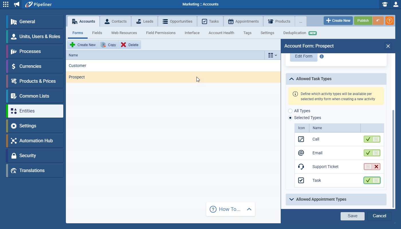 In order to streamline activity management, Admins can now associate specific task and/or appointment types with selected “Entity Form Type(s)“.
