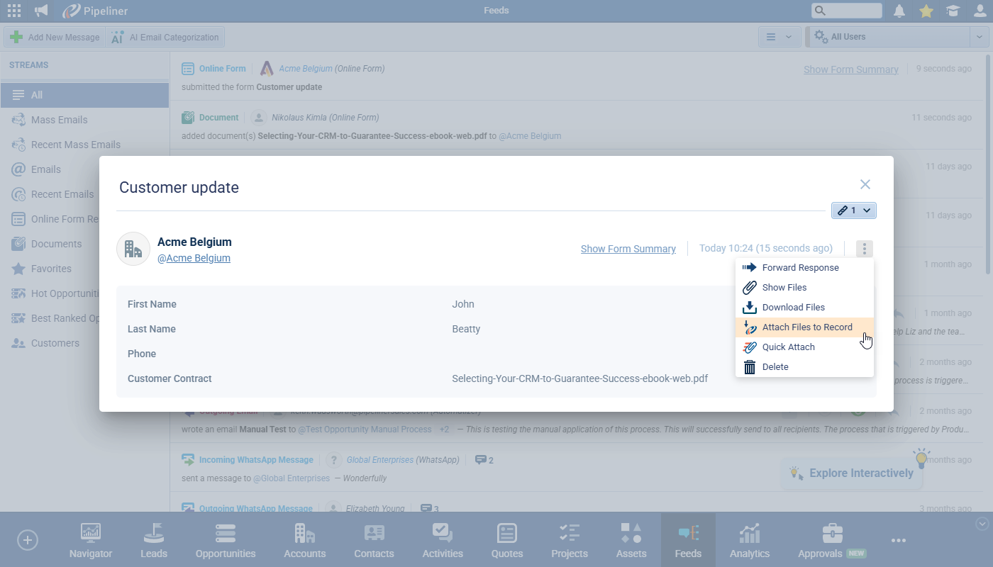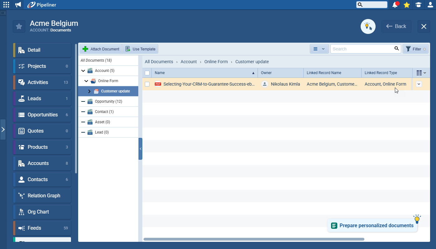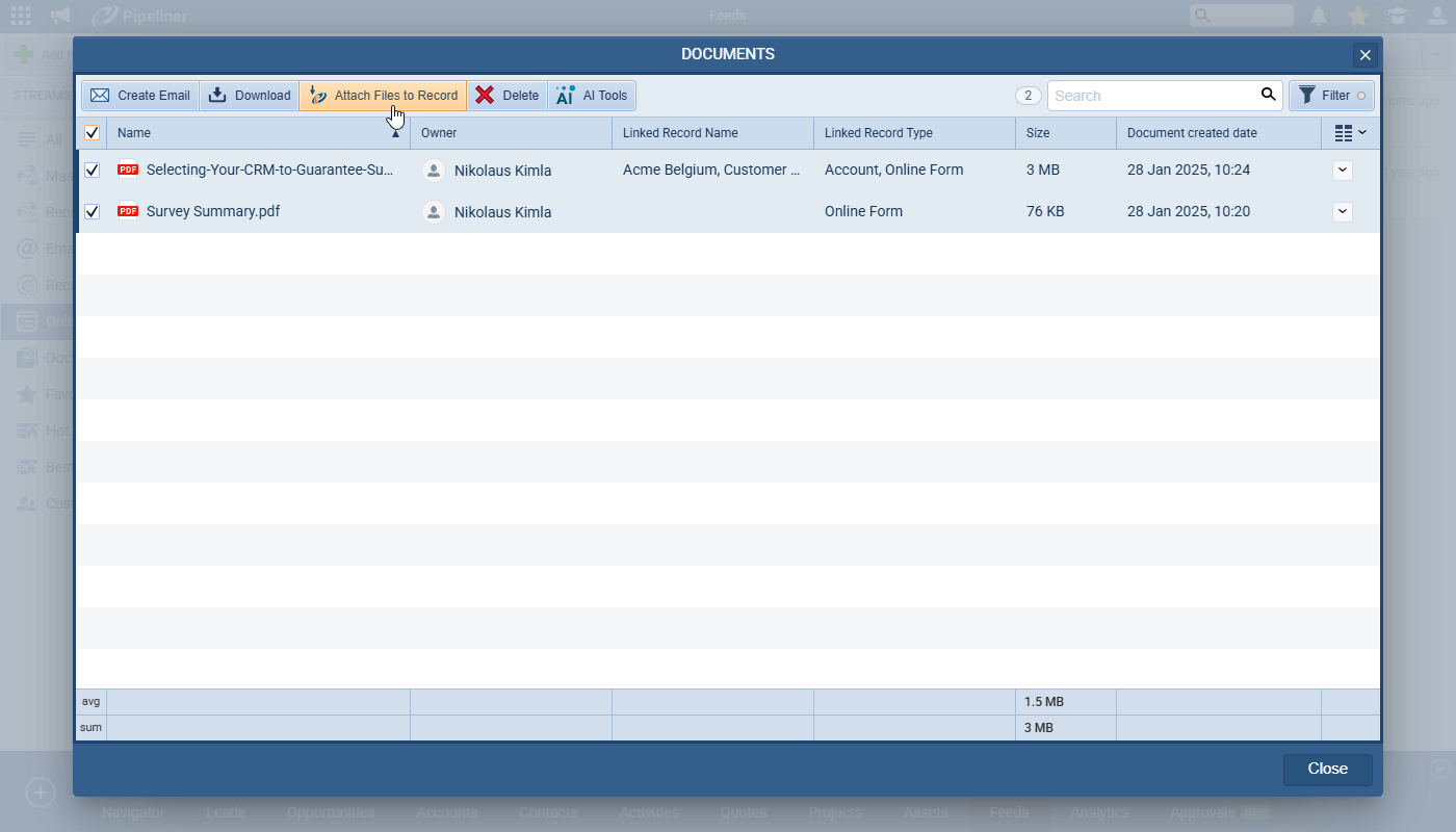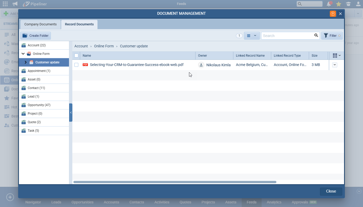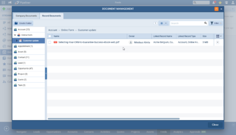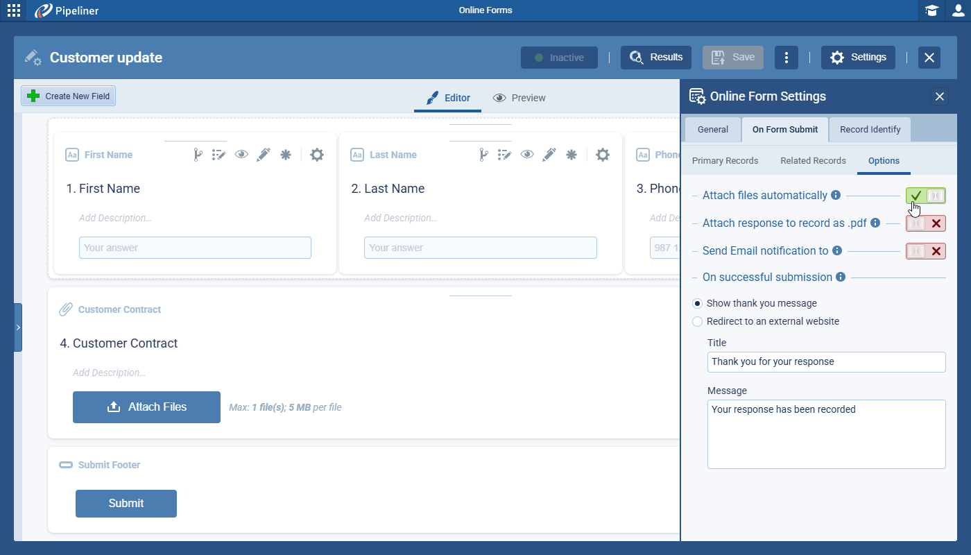 If files uploaded by respondents to an online form, should be automatically linked to related records, this option can be enabled in the “Online Form Settings“. When this option is enabled, the attached files will be visible in the “Documents” tab of the related record. Users can still manually link the files to different records using the “Attach Files” to “Record” button.