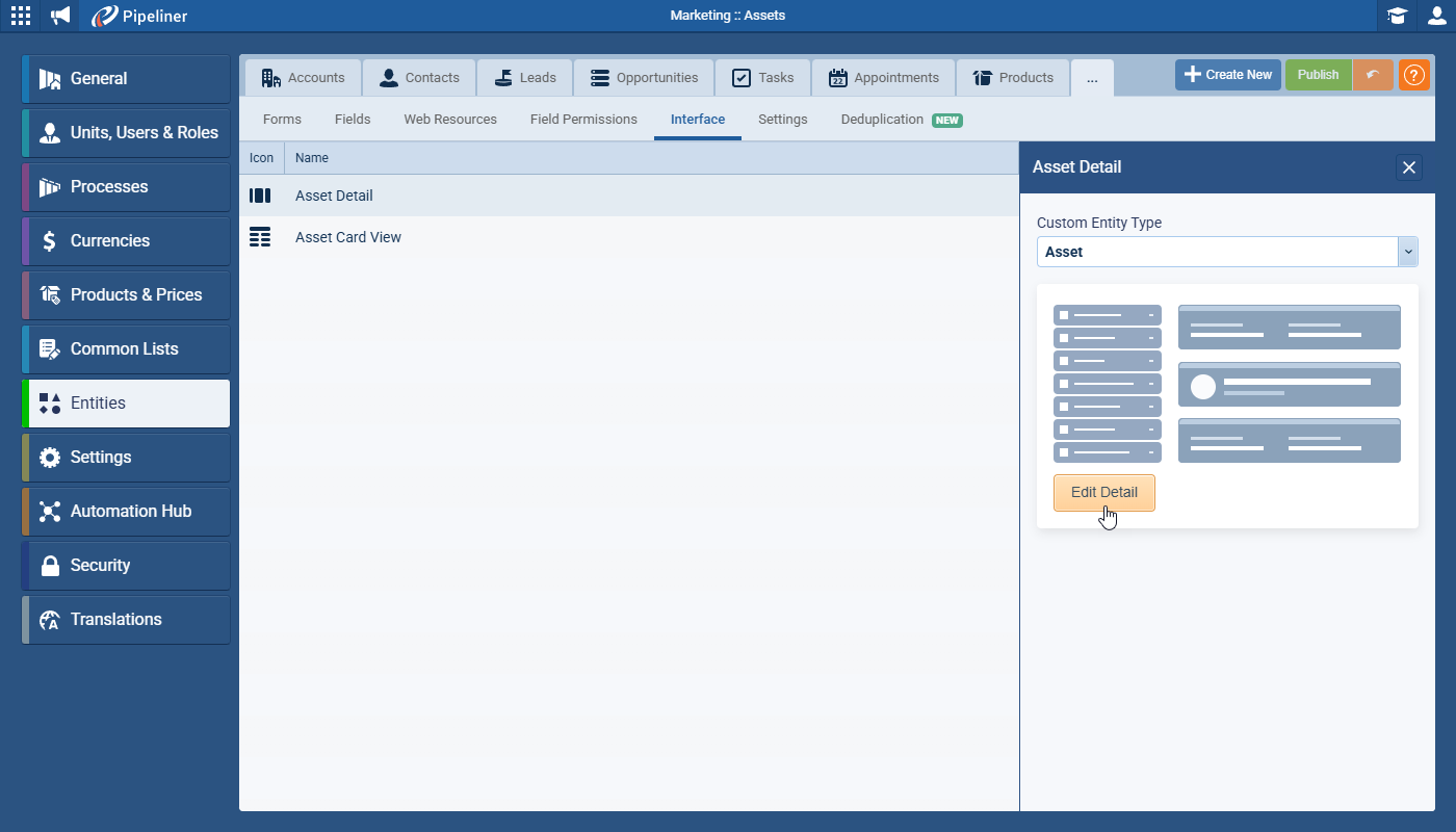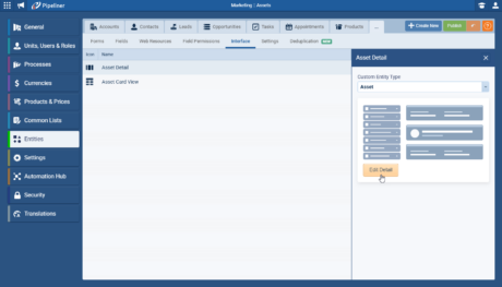 The interface for "Custom Entities" can now be customised in the same way as the system entities. Admins can hide "Tabs" or "Widgets" from "Entities › › Interface › Detail".