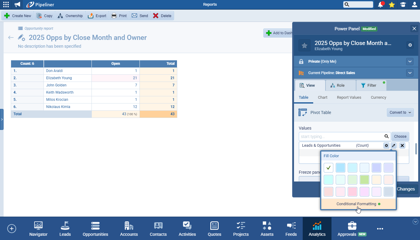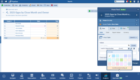 Users can now add conditional formatting to the values in "Pivot" table reports. Note that only fields used in "Rows", "Columns" and "Values" in the report can be used.
