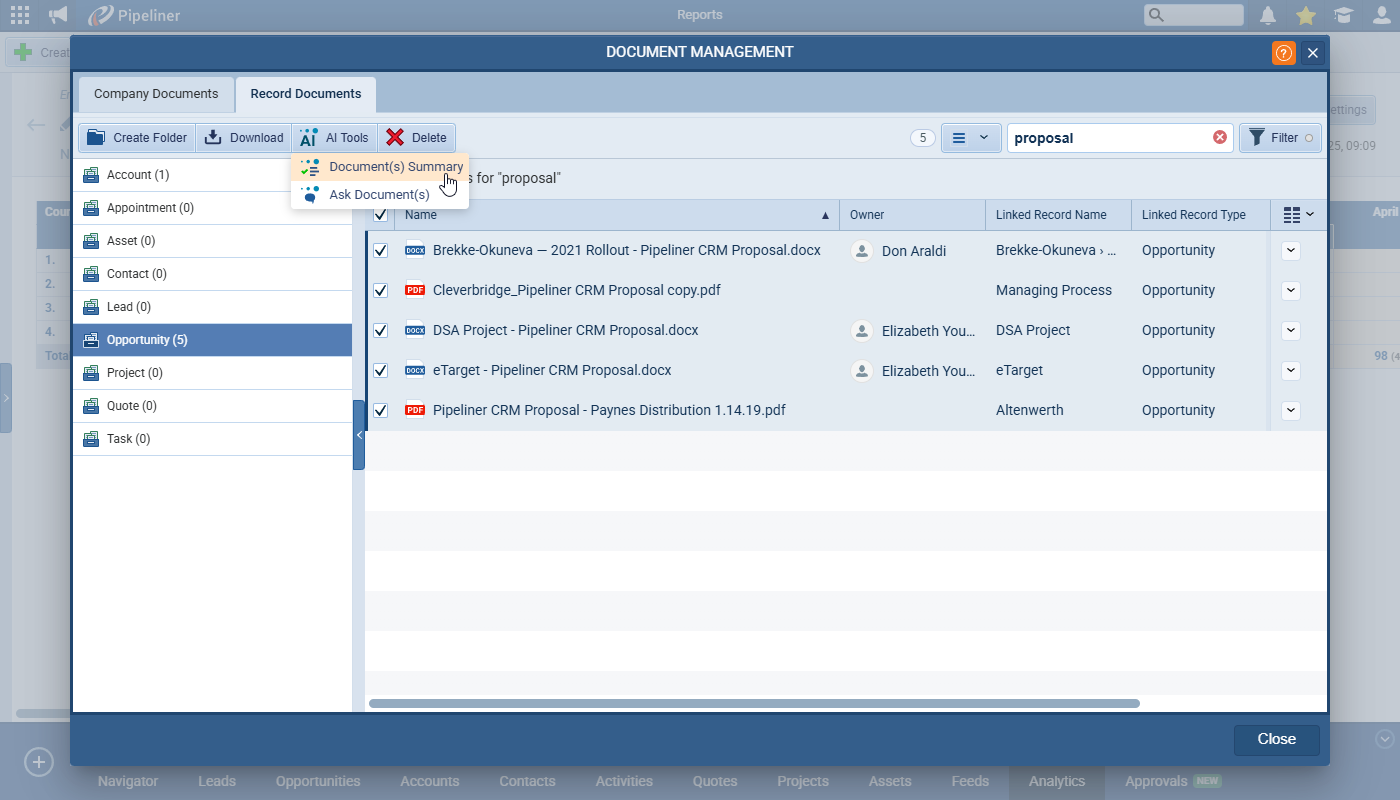 - Select the documents you want to know more about and then Ask the AI what what you want to know.