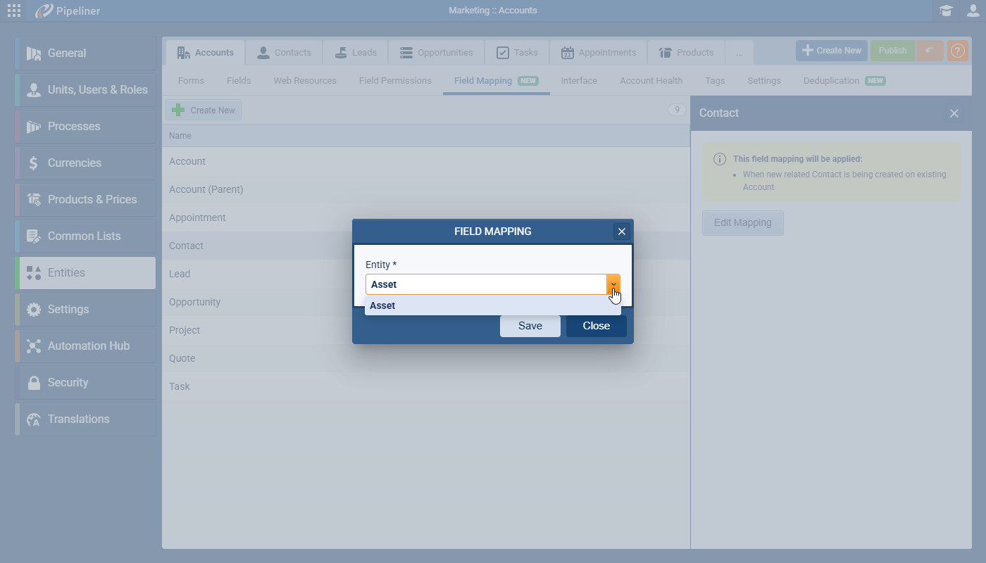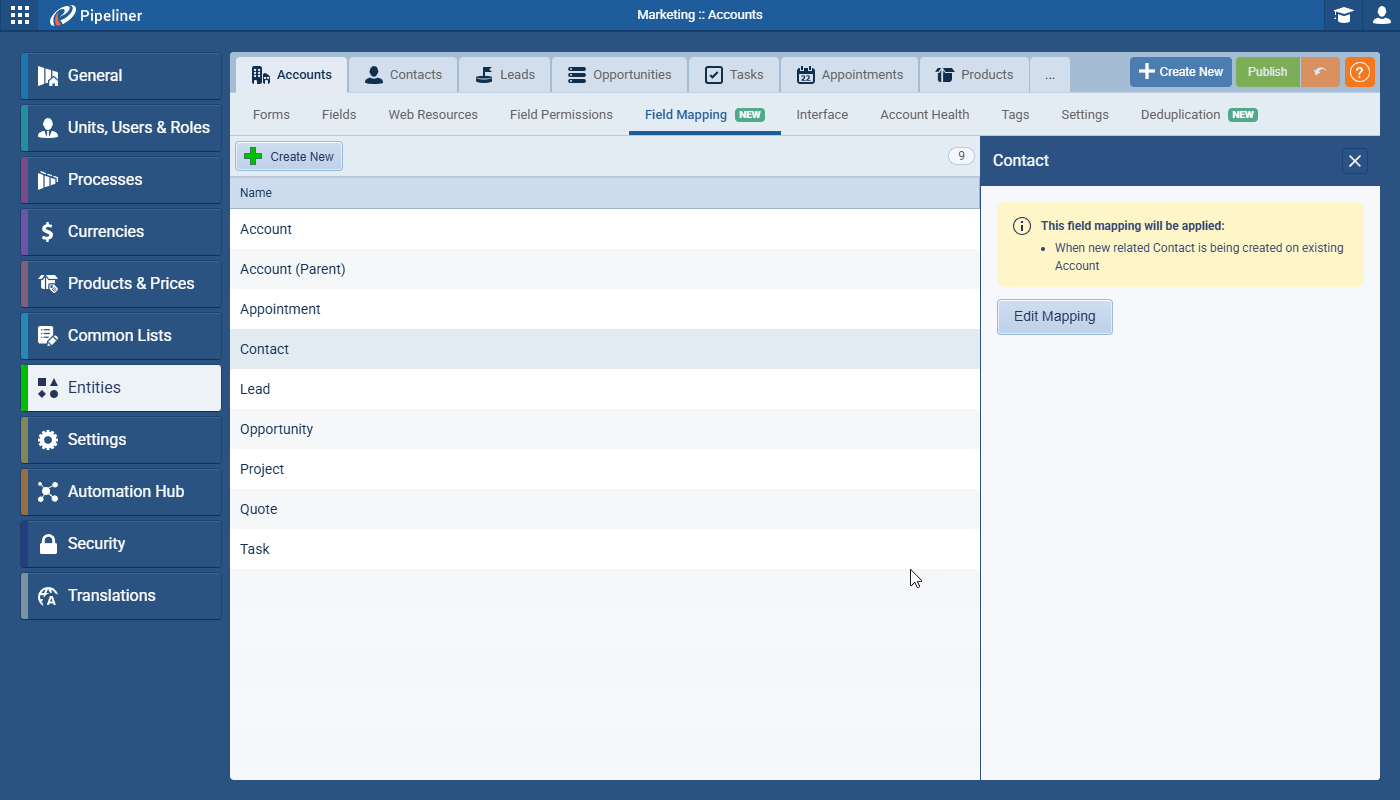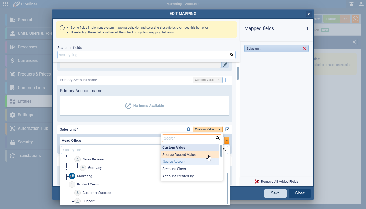 Once enabled, the Field Mapping Add-on will be available as a new sub-tab for all entities in Admin, except “ProductProduct Product refers to anything (an idea, item, service, process or information) that meets a need or a desire and is offered to a market, usually but not always at a price.” and “Product Line Items“. All system hardcoded mappings will be available for the Admin to change. System mappings cannot be deleted but can be modified or reset back to the system default behaviour. These system mappings are noted on the form and can be reset to the default behaviour by unticking the checkbox to disable the custom mapping.