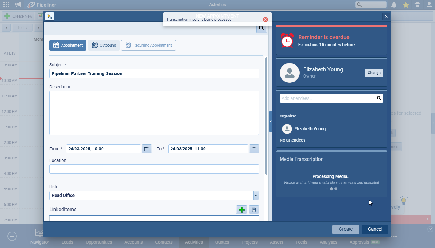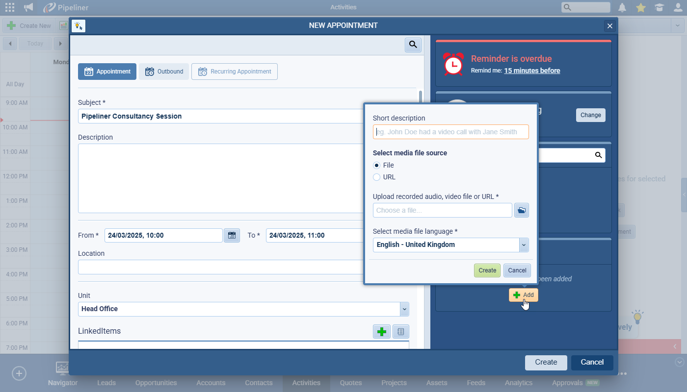 Voyager AI Media Transcription now brings the ease and efficiency of working with our “Call Recording” feature to Appointments. Users can upload a recording of a meeting to an Appointment in Coevera by adding the URL of the recorded meeting or by uploading an MP4 file. The Media Transcription will then process the video/audio and will create a transcription and summarization which the userUser User means a person who uses or consumes a product or a service, usually a digital device or an online service. can then copy to a field (e.g. Appointment Description) as required. This feature requires the purchase of credits which is managed from the “Communication” tab within the “CustomerCustomer Customer is an individual or an organization that purchases a product or signs up for a service offered by a business. Portal“.