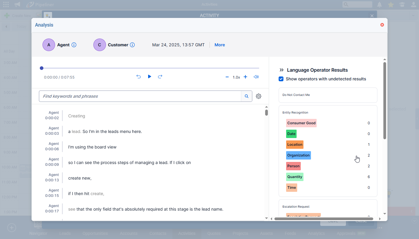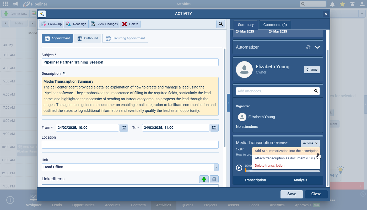 As well as reviewing the “Transcription and Analysis“, the user can listen to the recording or use the Actions dropdown to “Add AI” summarization into the description field of the “Activity“, “Attach” transcription as document (pdf) or “Delete Transcription“.