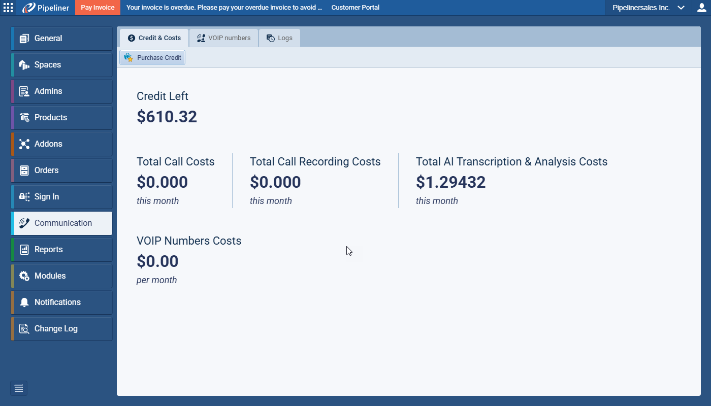 Credits are managed and added from the “Communication” tab in the Subscription main menu. Credits are shared across “Media Transcription“, “Calling & MessagingMessaging Messaging is the process of communicating your brand’s value proposition, the benefits you offer, and the perceived meaning of such communication among your target audience.“.