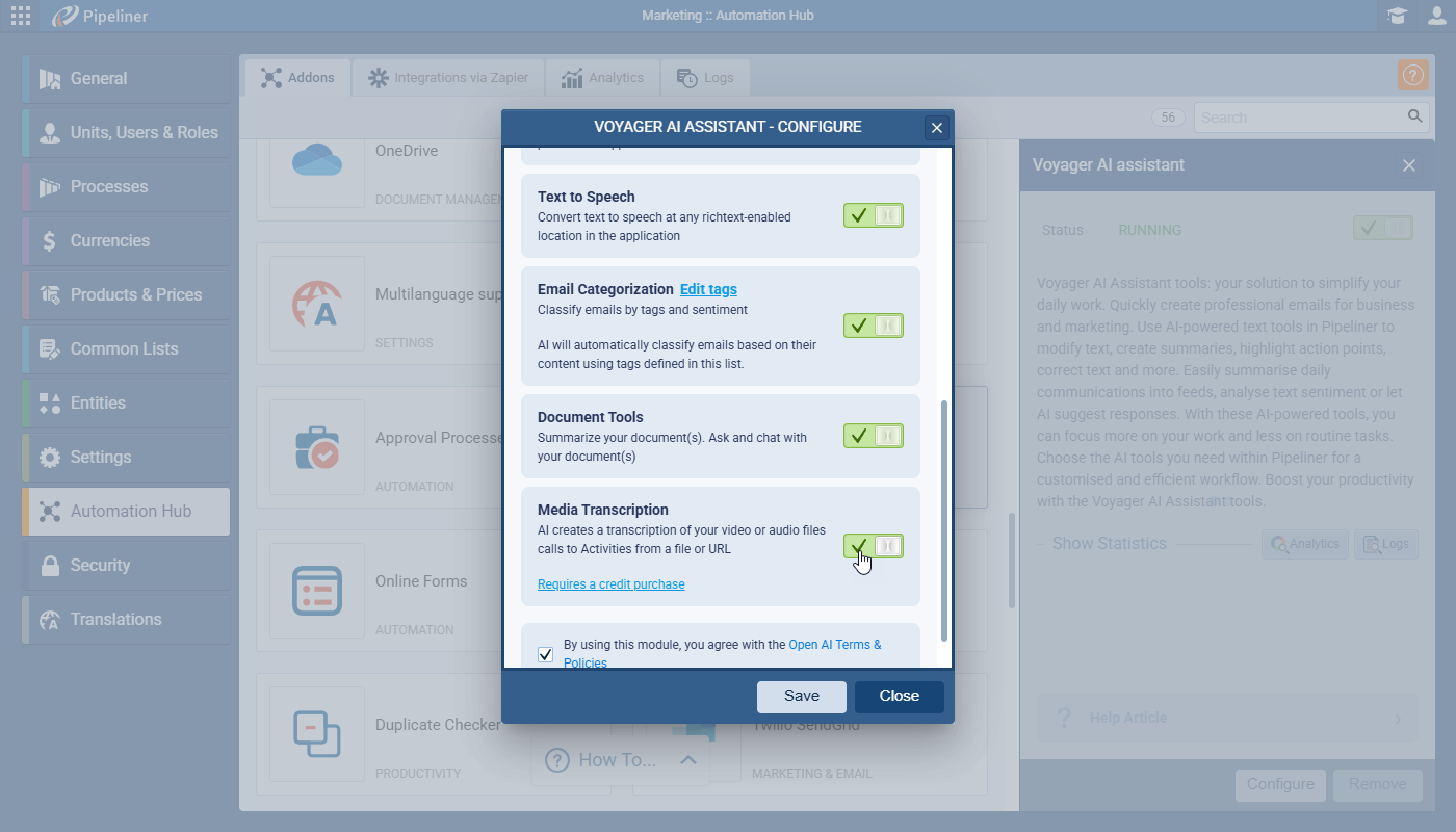 Administrators can enable “Media Transcription” from the “AI Voyager>Configure” option in the Automation Hub.