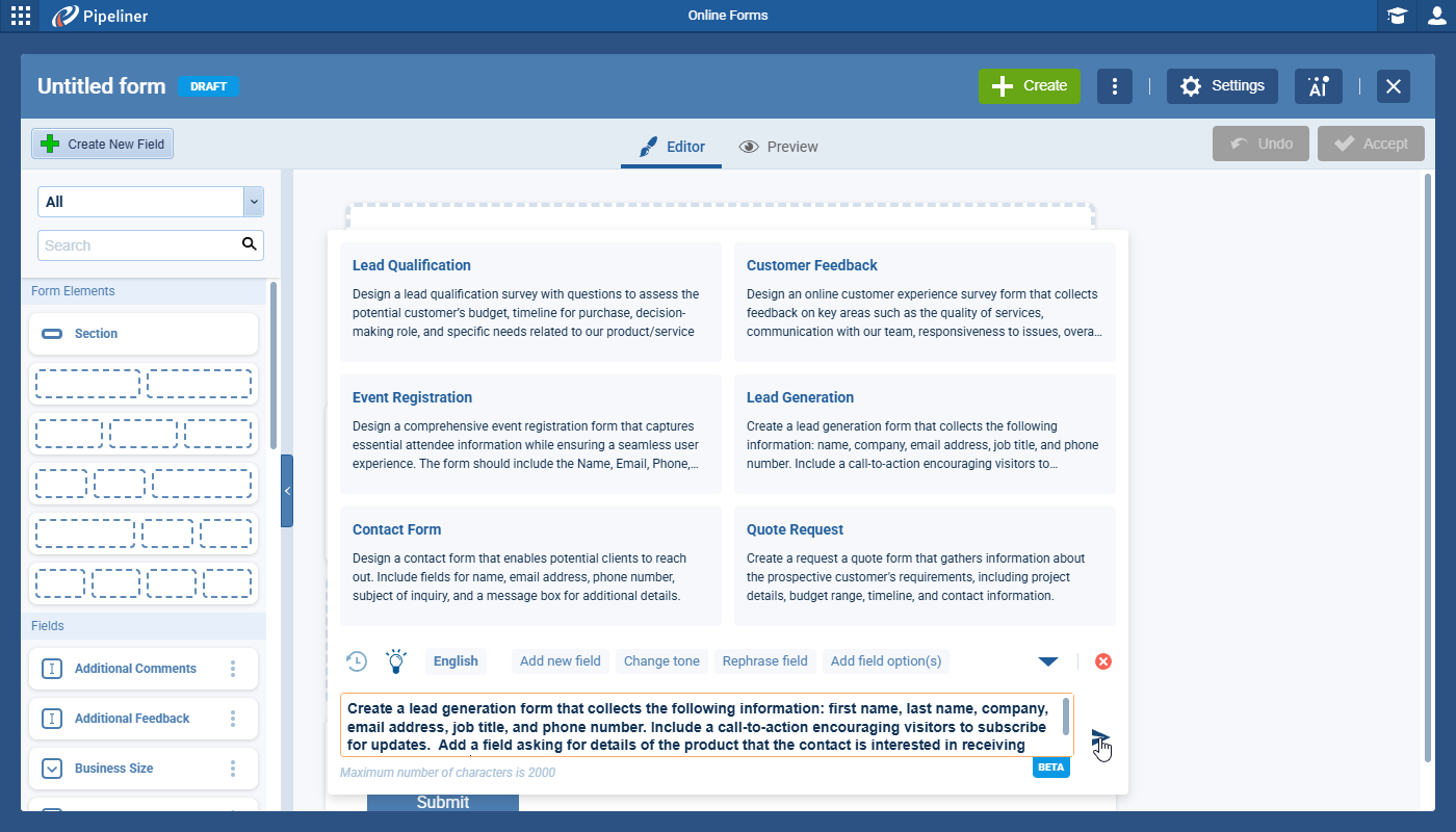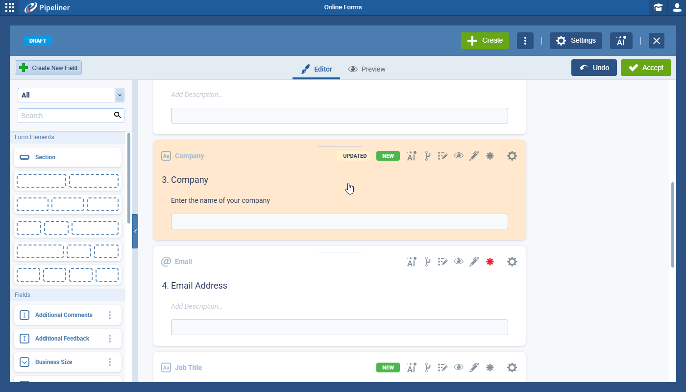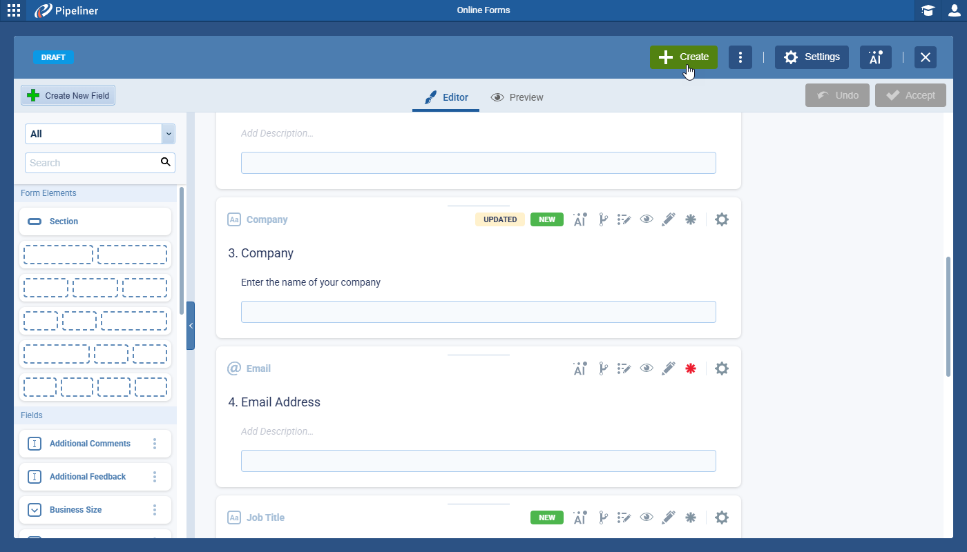 All changes can be applied by clicking “Accept” or reversed by clicking “Undo“. Once the user is happy with the contentContent Content refers to a material or document released in various forms (such as text, image, audio, and video) and created to inform, engage or influence specific audiences. and layout of the Form, they need to click on the “Create” button in order to create the form and can then add the required “Settings” such as record matching.