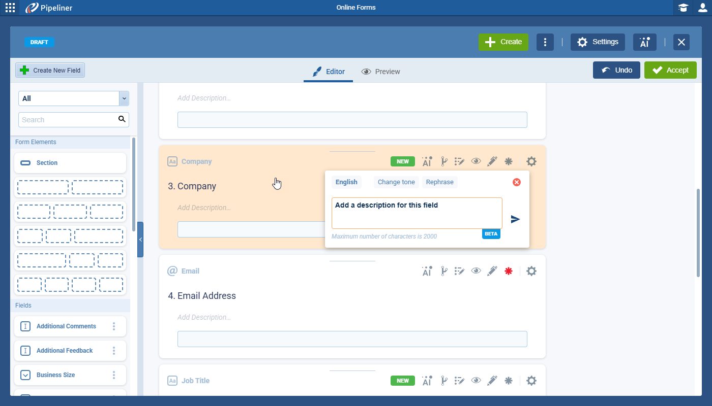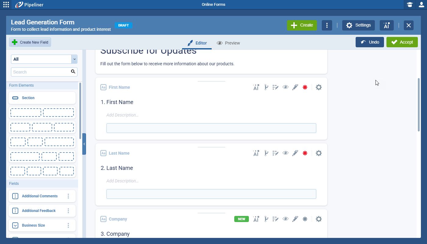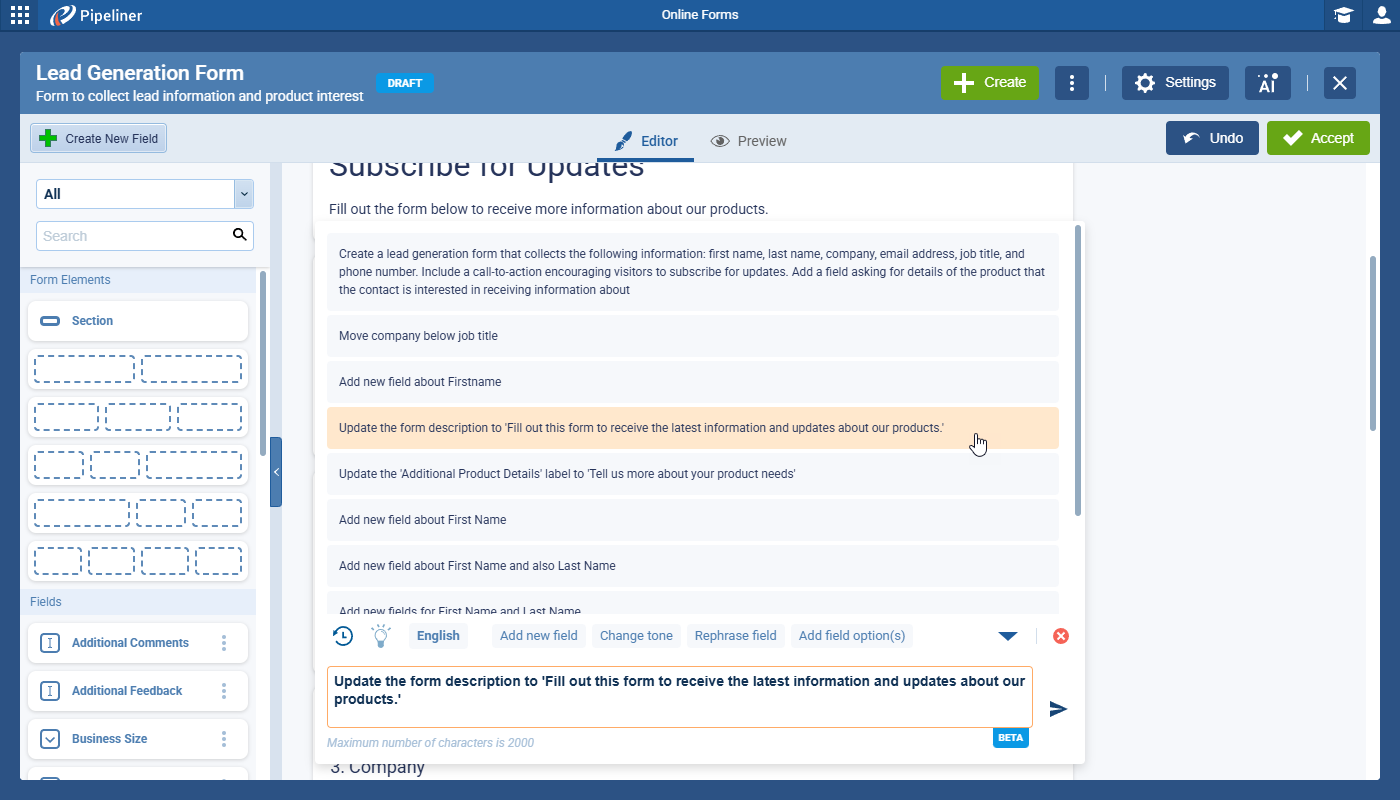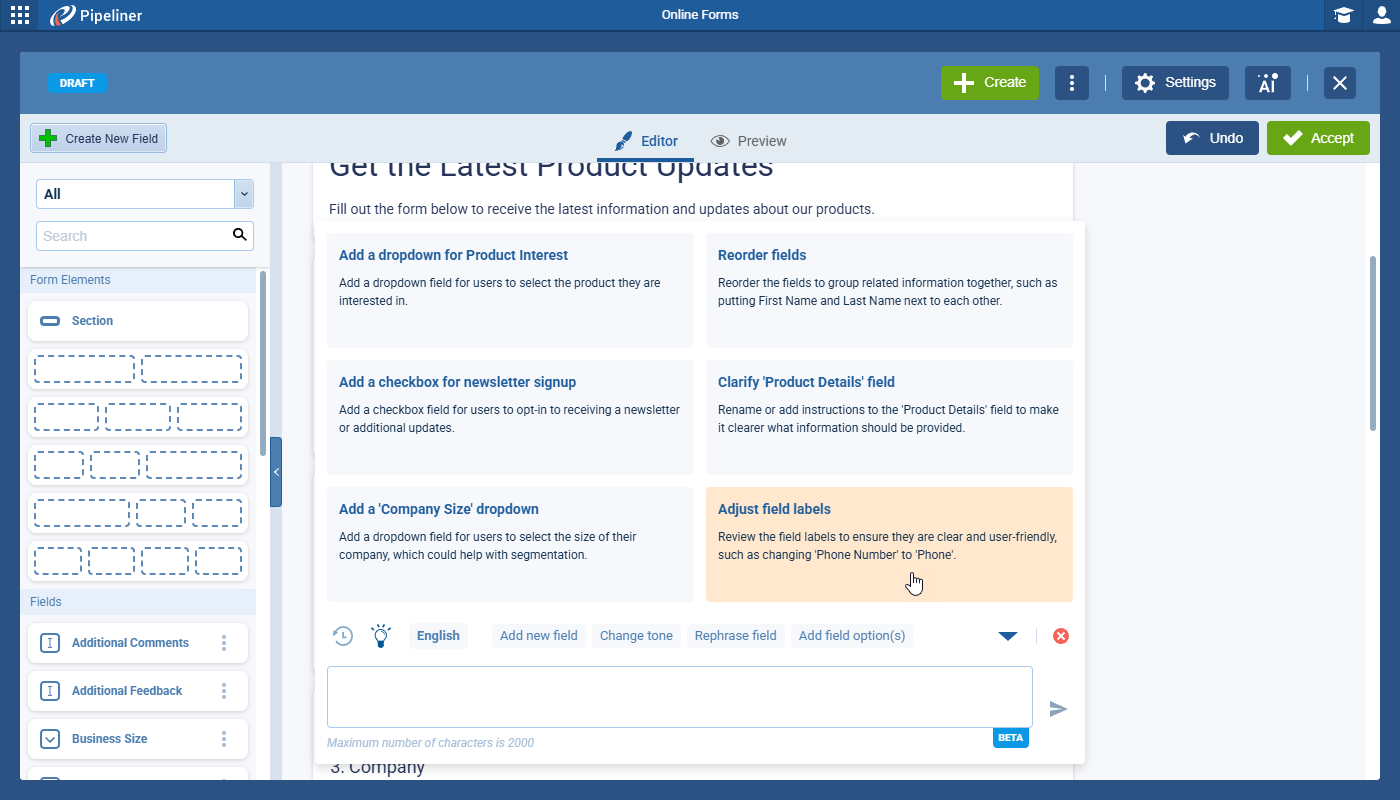All changes can be applied by clicking “Accept” or reversed by clicking “Undo“. Once the user is happy with the contentContent Content refers to a material or document released in various forms (such as text, image, audio, and video) and created to inform, engage or influence specific audiences. and layout of the Form, they need to click on the “Create” button in order to create the form and can then add the required “Settings” such as record matching.