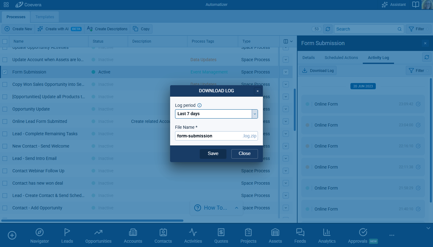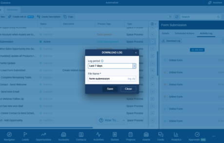 Users can choose a specific time range when exporting activity logs instead of always downloading the full history. The download dialog includes period options: Last 3 days, Last 7 days (default), Last 14 days, Last 30 days, Last 60 days, Last 180 days, and All. The export includes only activities within the selected period, reducing file size and improving usability for long-running processes. The dialog communicates that logs are limited to a maximum of 100k records. ⤵