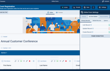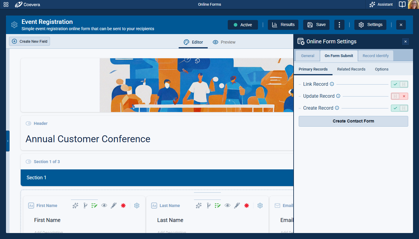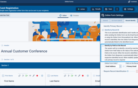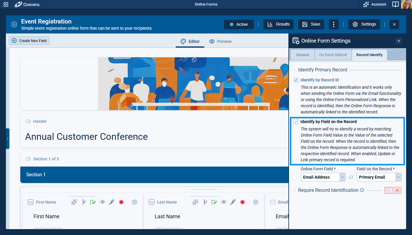 When Identify by Field on the Record is enabled in record identification, the form configuration now requires a compatible primary-record action path. At least one option that supports existing-record handling must be enabled, preventing conflicting setup combinations at configuration time. The default behavior guides users toward a valid setup by preselecting the Link Record.