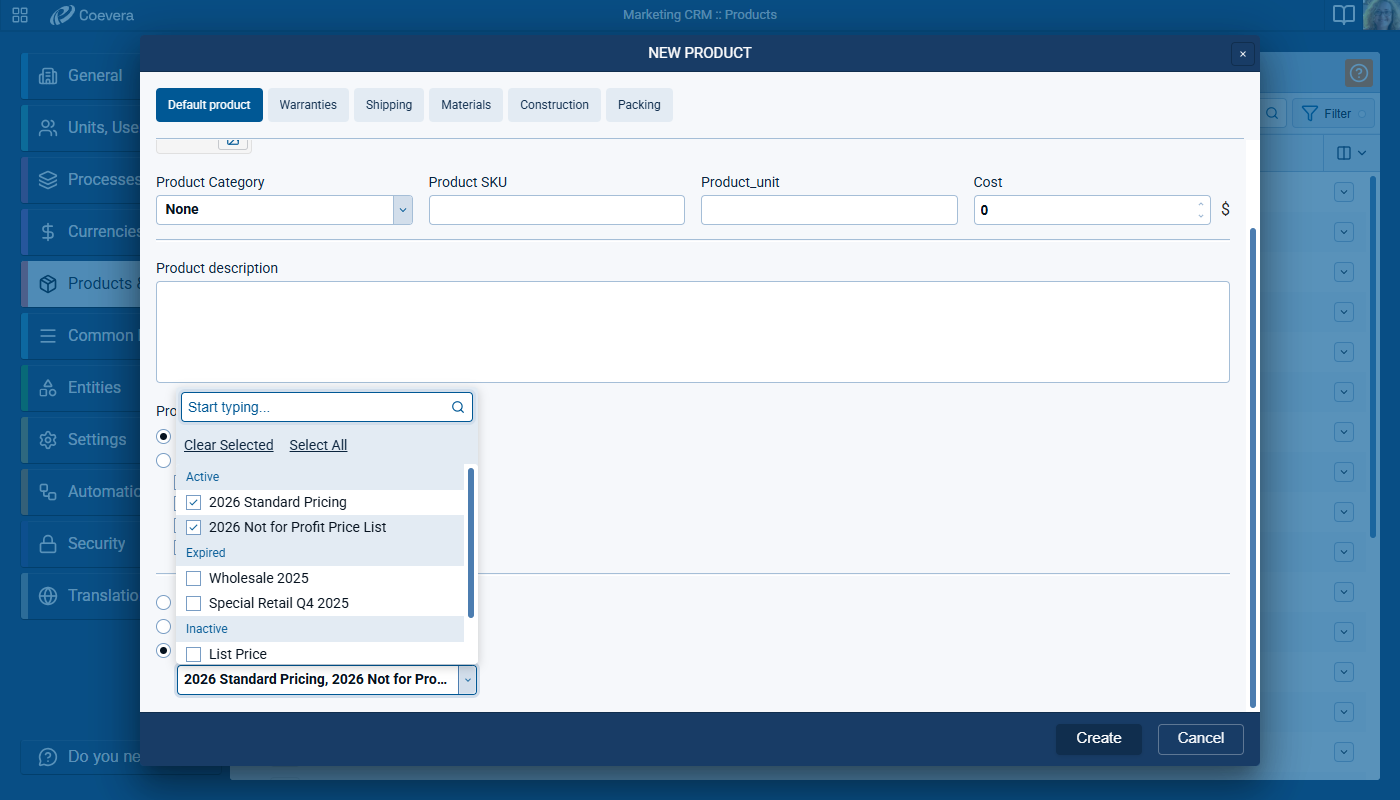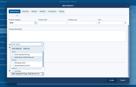 When creating a new product, users can define price-list assignment as part of the creation workflow. The setting provides three explicit choices: Don't add to Price Lists, Add to all Active Price Lists, and Add to selected Price Lists.
