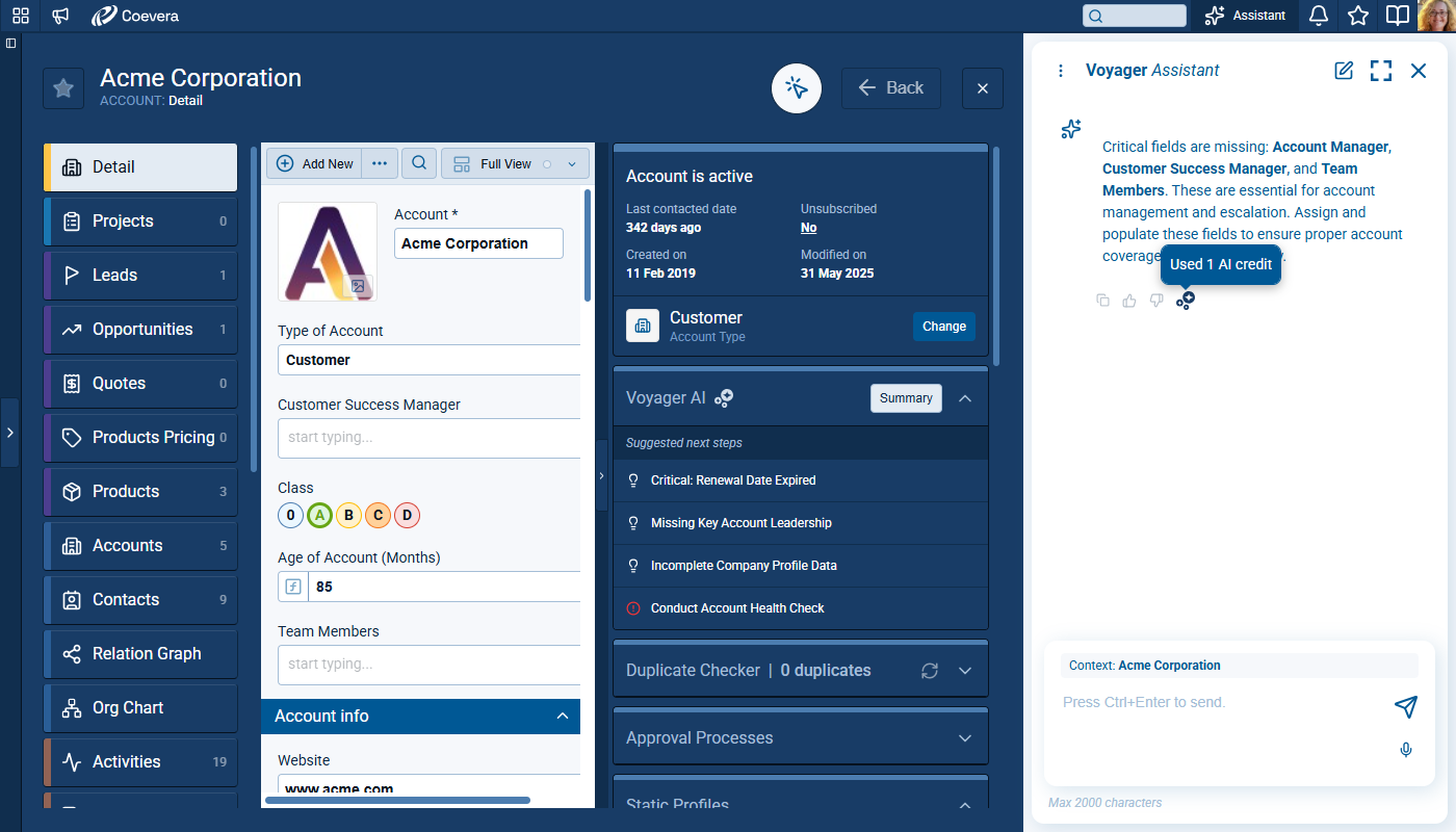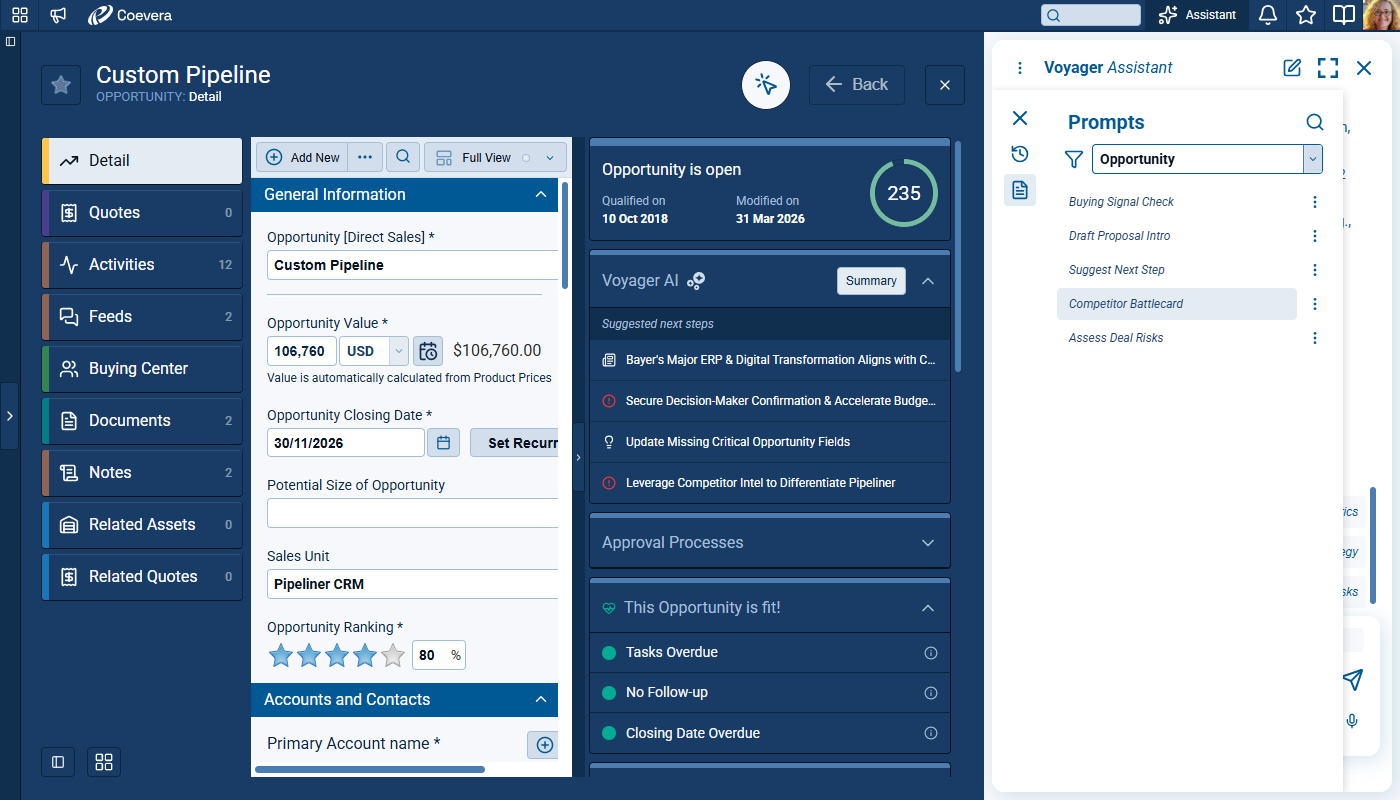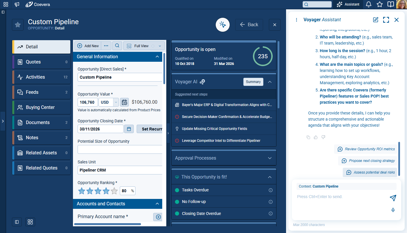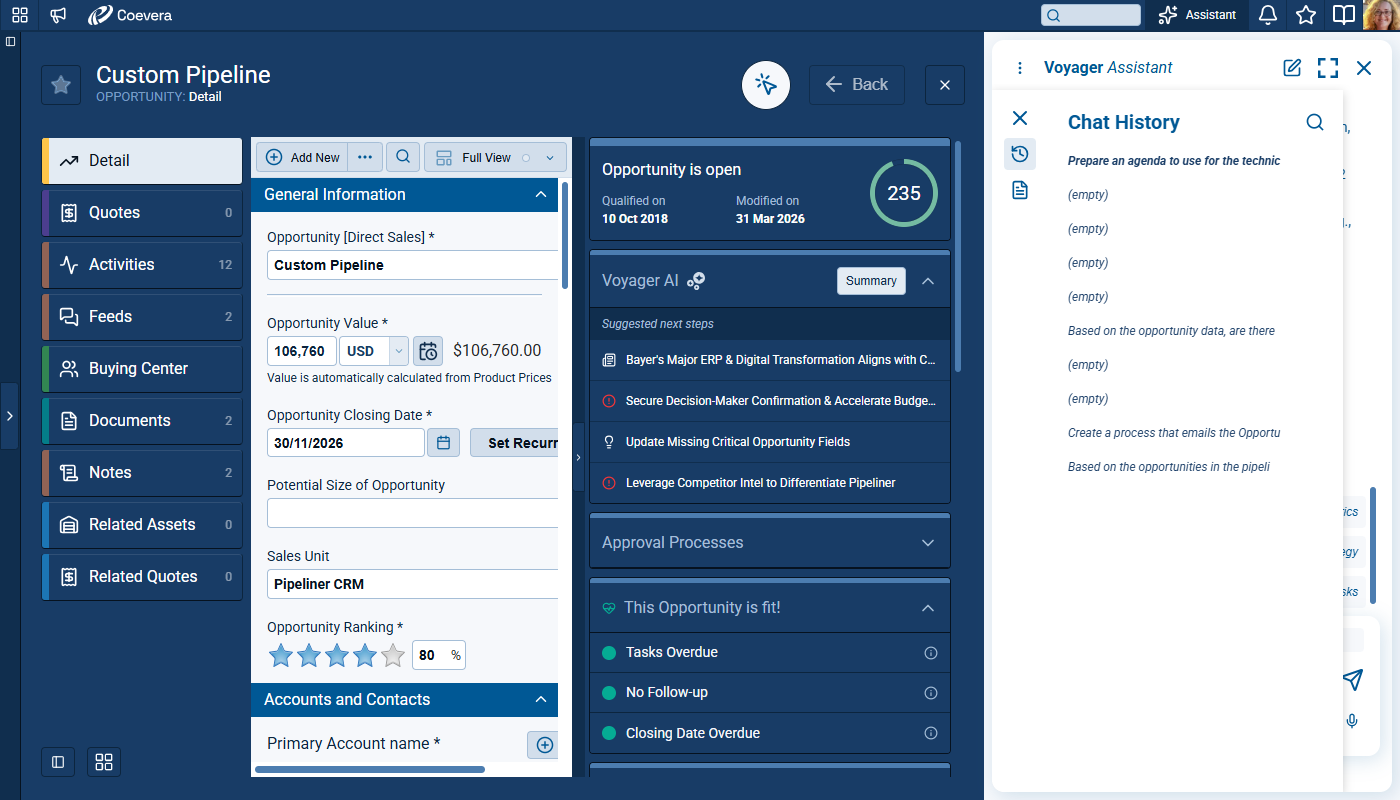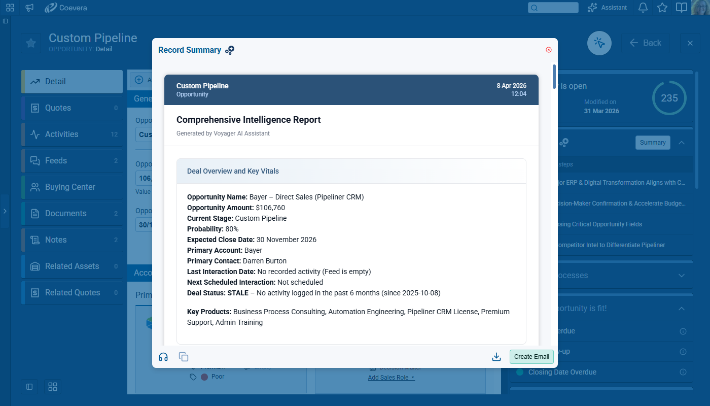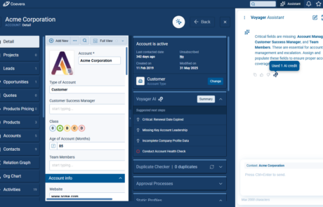 Voyager 2’s AI Record Assistant adds an in-context assistant inside individual CRM records so users and teams can understand situations more quickly, decide next actions with higher confidence, and move directly from insight to execution. The Record Assistant combines guided summaries, actionable suggestions, and record-aware chat in one continuous workflow.