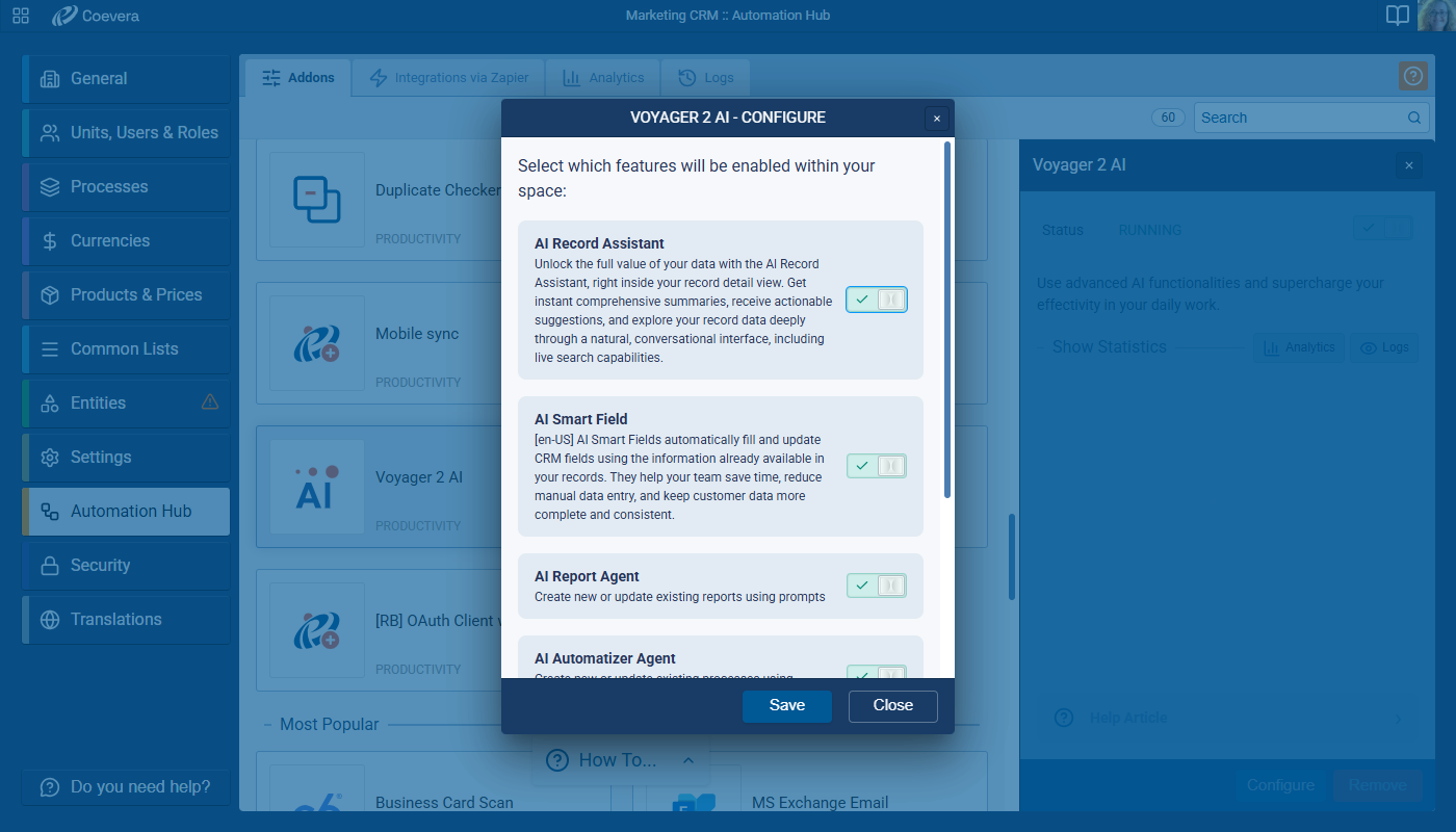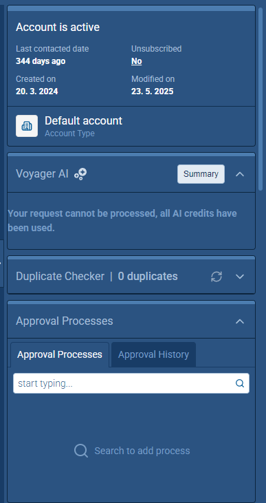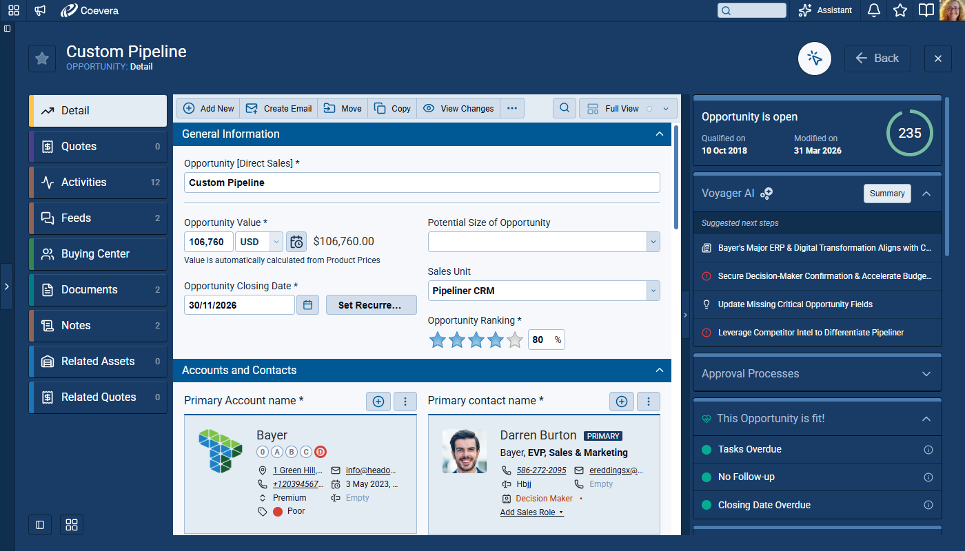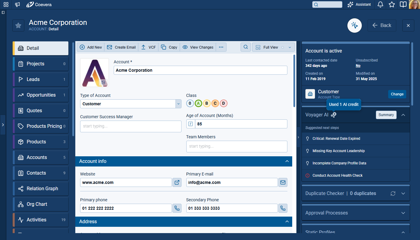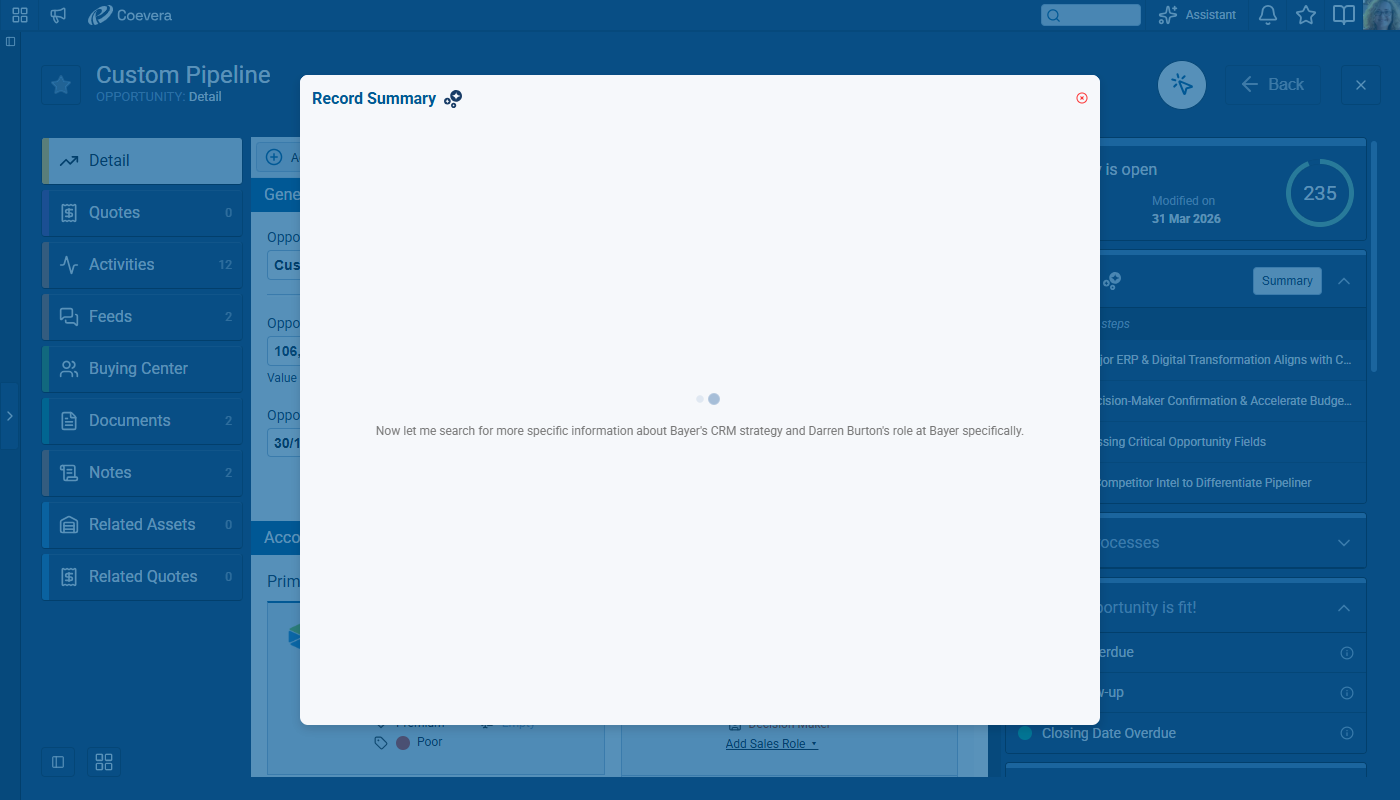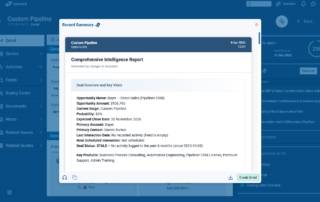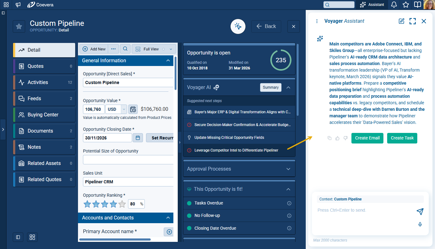 Voyager 2’s AI Record Assistant adds an in-context assistant inside individual CRM records so users and teams can understand situations more quickly, decide next actions with higher confidence, and move directly from insight to execution. The Record Assistant combines guided summaries, actionable suggestions, and record-aware chat in one continuous workflow.