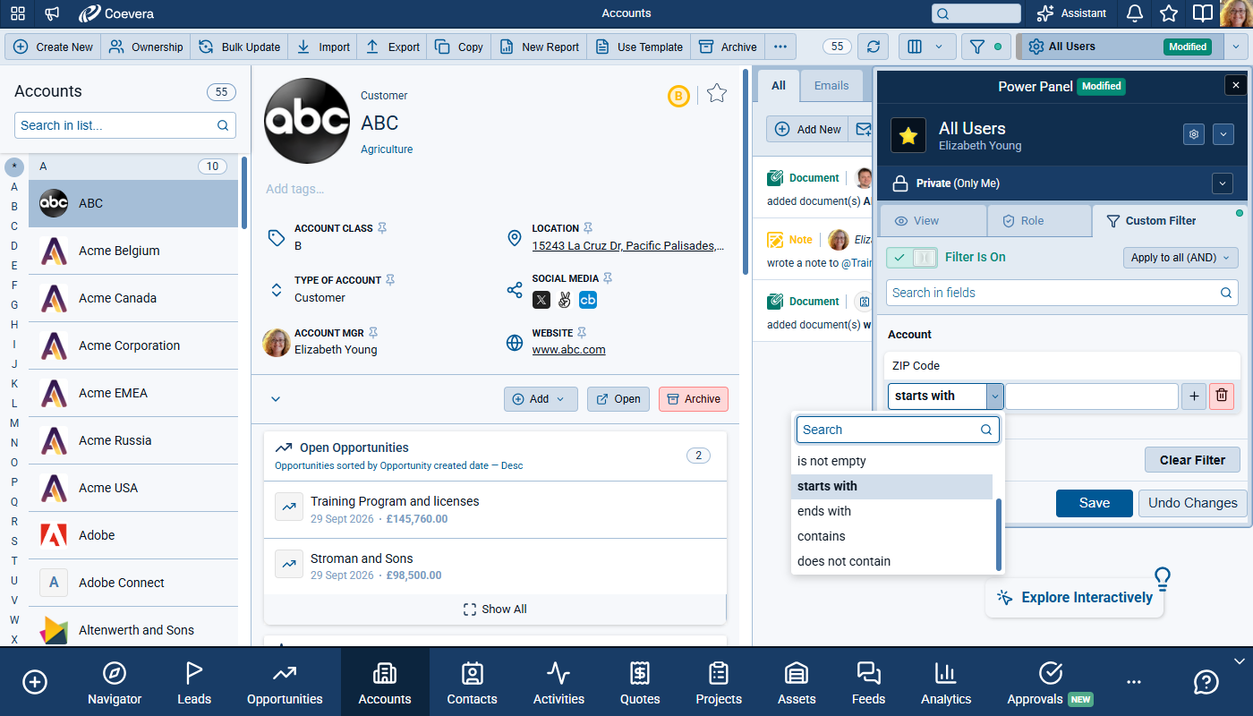 Users can now filter text-based fields with two additional operators: begins with and ends with. You'll find these between the is not empty and contains in the filter condition lists. This addition enables precise prefix and suffix filtering scenarios, including structured values such as postal-code patterns.