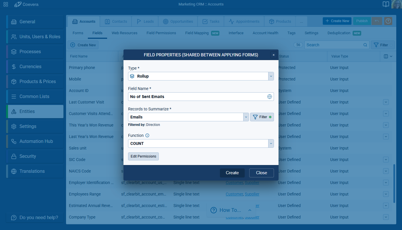 - In Admin › Entities › Rollup field, users can now select Emails as records to summarize for Account, Contact, LeadLead Lead refers to a prospect or potential customer (who can be an individual or organization) that exhibits interest in your service or product; or any additional information about such entity., Opportunity, Quote, Project, and Custom Entities and Text Messages as records to summarize for Account, Contact, Lead, Opportunity, Quote, and Project.