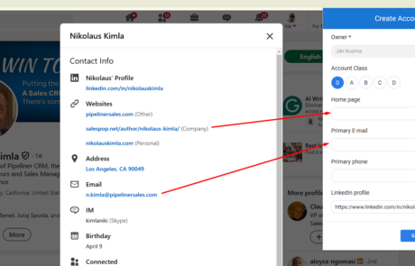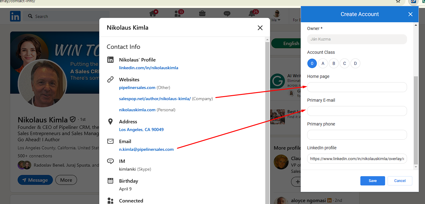 When a userUser User means a person who uses or consumes a product or a service, usually a digital device or an online service. opens LinkedIn contact information and starts creating a new accountAccount Account refers to a record of primary and background information about an individual or corporate customer, including contact data, preferred services, and transactions with your company. or contact from the WebClipper extension, additional contact data is now prefilled.