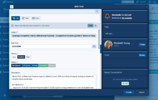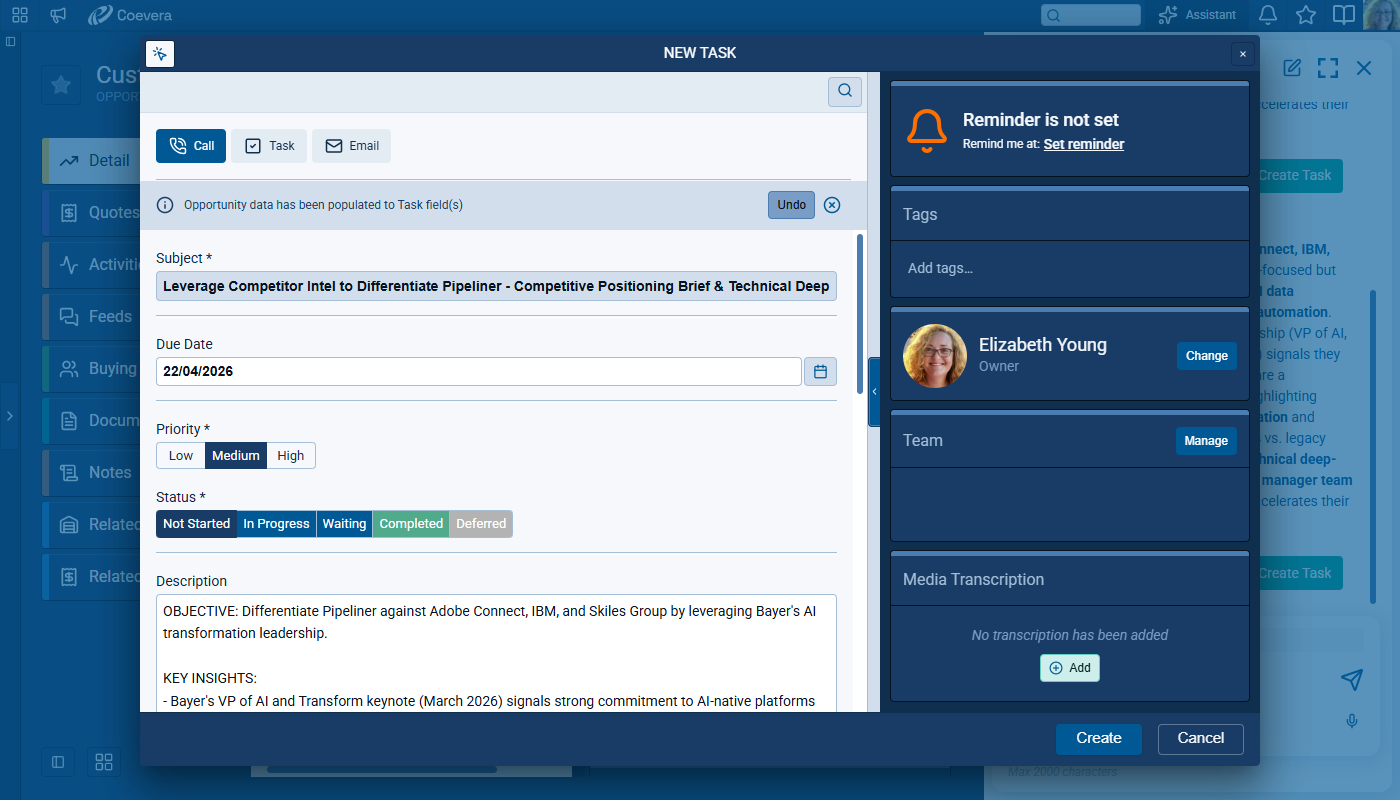 Users can trigger practical actions from the suggestions, including creating tasks, appointments, notes, and emails which pre-fill with information from the suggestion to accelerate execution. ⤵