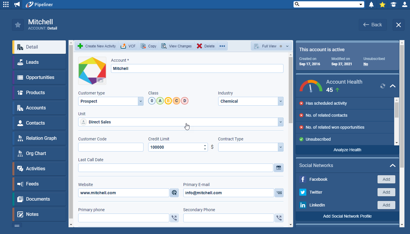 The new, “at a glance” Account Health helps you instantly understand the status of the relationship with Accounts in Coevera. You can view Account Health by using the widget in the right-hand panel for each individual company record ⤵