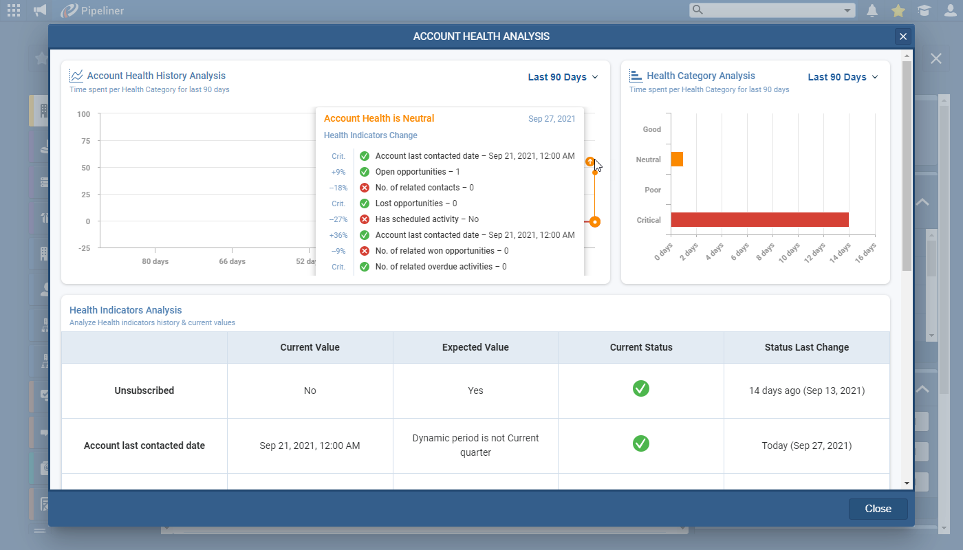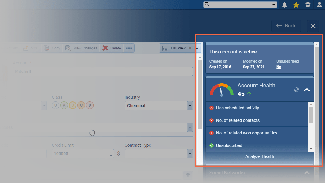 - When a userUser User means a person who uses or consumes a product or a service, usually a digital device or an online service. creates or updates a record, Account Health is calculated in real-time. However when the user updates related records that are only linked to this Account, the user will need to manually refresh Account Health through the Account Health widget — for example, if a user completes an activity that will impact “Last Contacted Date”, they will need to refresh Account Health manually to see the effect.