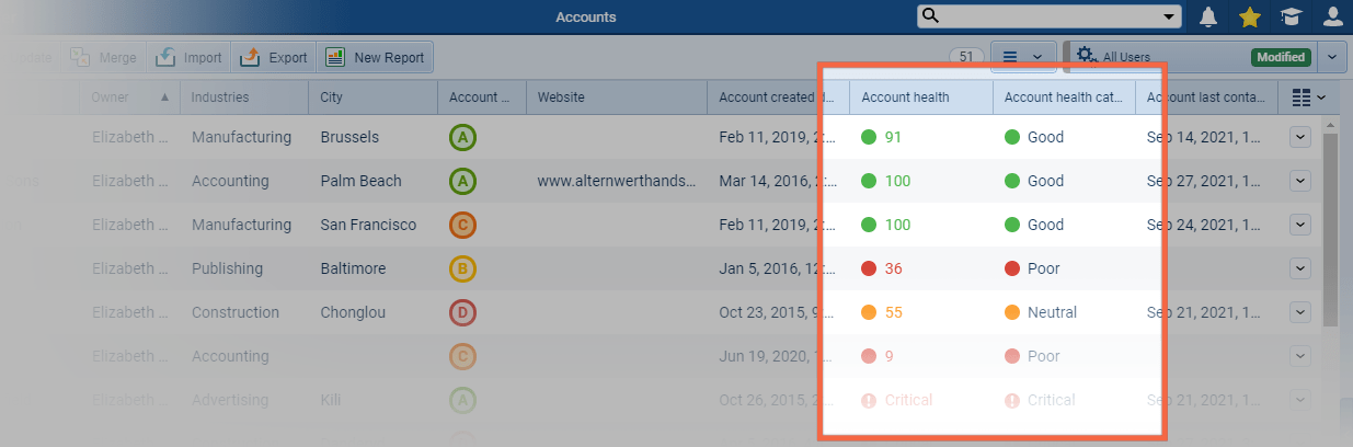 - Account Health › this field represents the score/value of account health. On list view & in reports, this field is visualized as (score + Category).