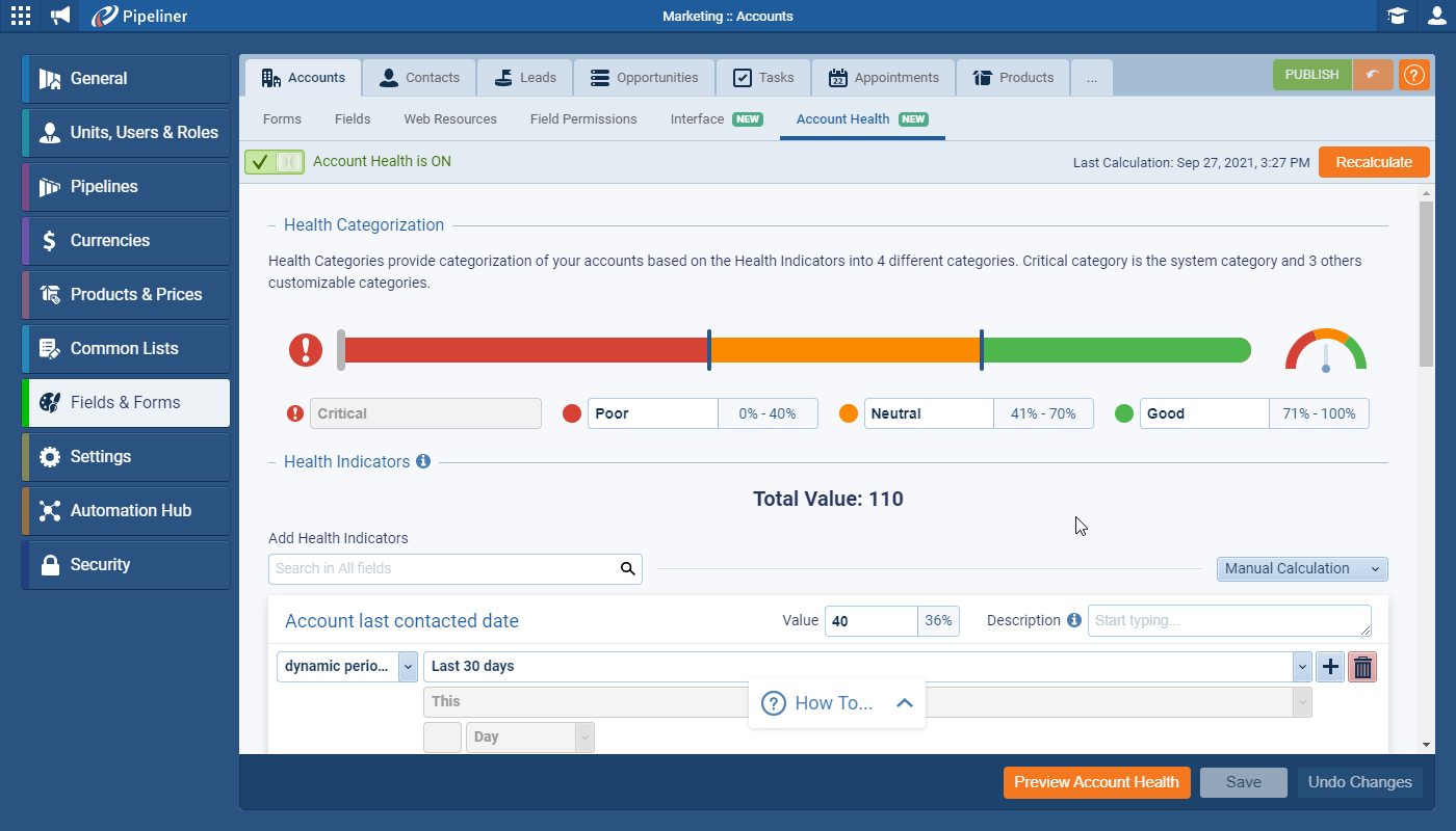 - Account Health is automatically re-calculated overnight and the Last Recalculation date/time is visible in Admin in Account Health.