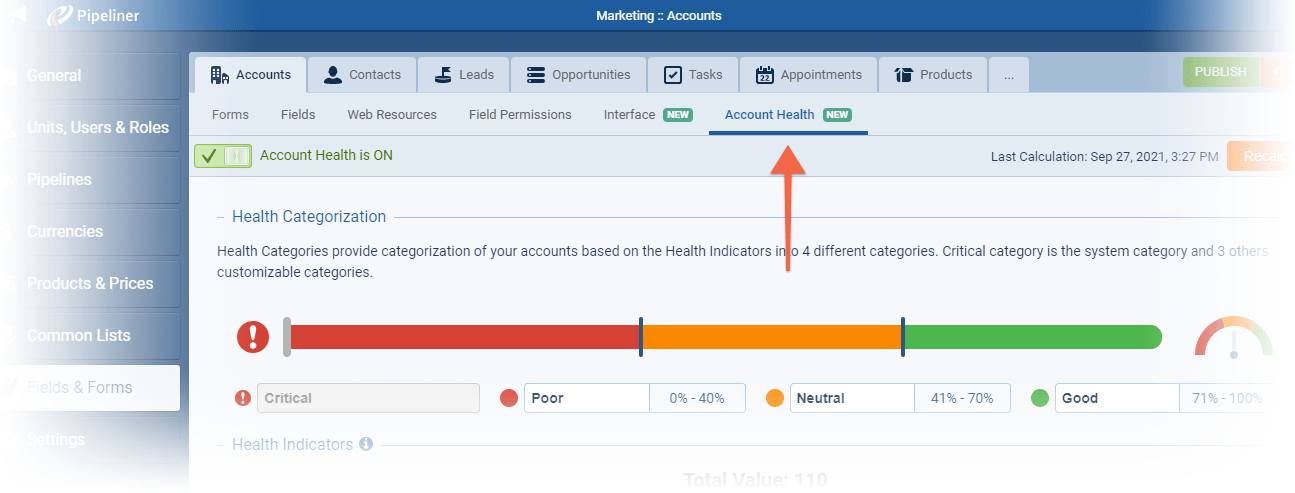 There are 4 Health Categories › “Critical” (default, unmodifiable, system category) and 3 other categories that can be modified by changing the name and the scoring range.