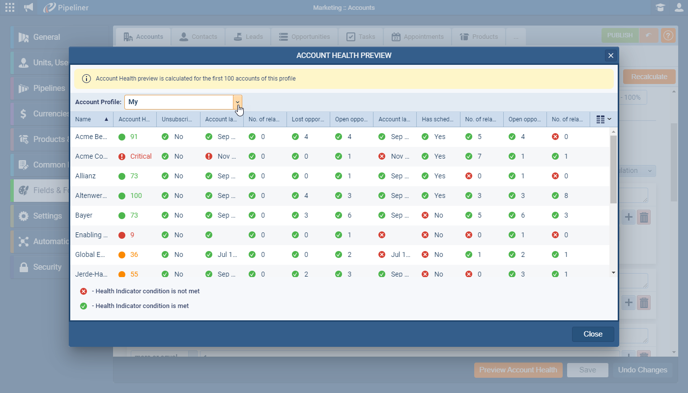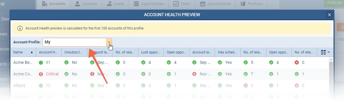 Click on the “Preview Account Health” button to view how your newly added/modified account health indicators influence the results in Account health. Select a profile and, if the condition is met for the indicator, you can immediately see it in the list view ⤵